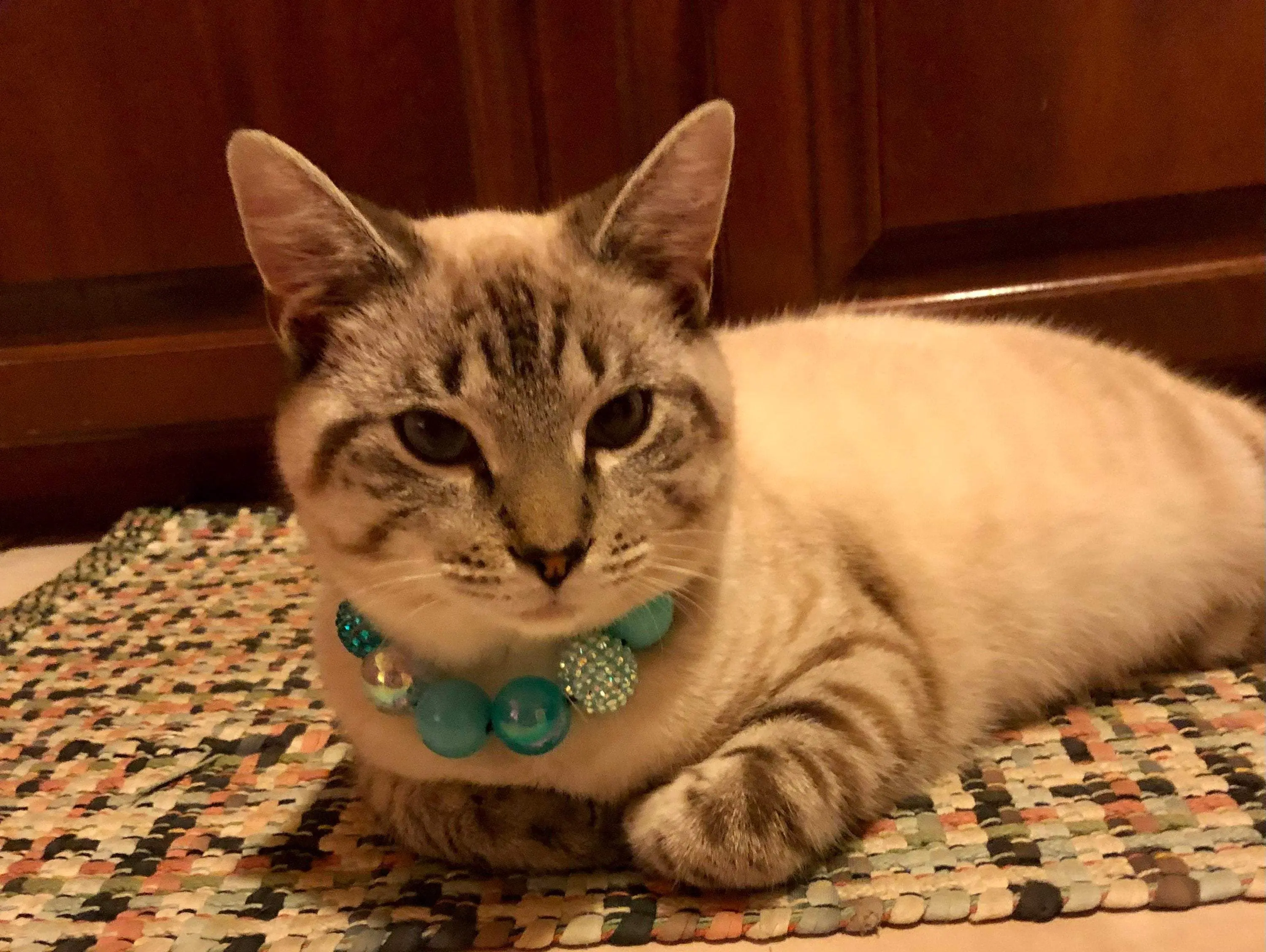 Shades of Gorgeous Tiffany Blue. My cat Henry & my client’s dog Dixie is wearing the Tiffany collar with no white accents. This design now comes with no white accent beads. If you want the white rhinestones added or any other changes made please send a note to seller at checkout.