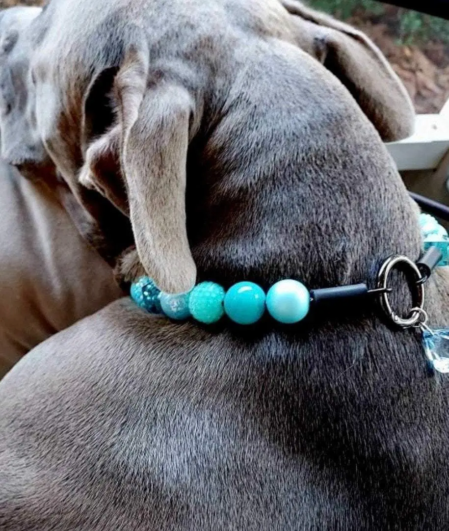 The Tiffany Blue Beaded Dog Collar comes on black coated wiring & covers with a black o ring.