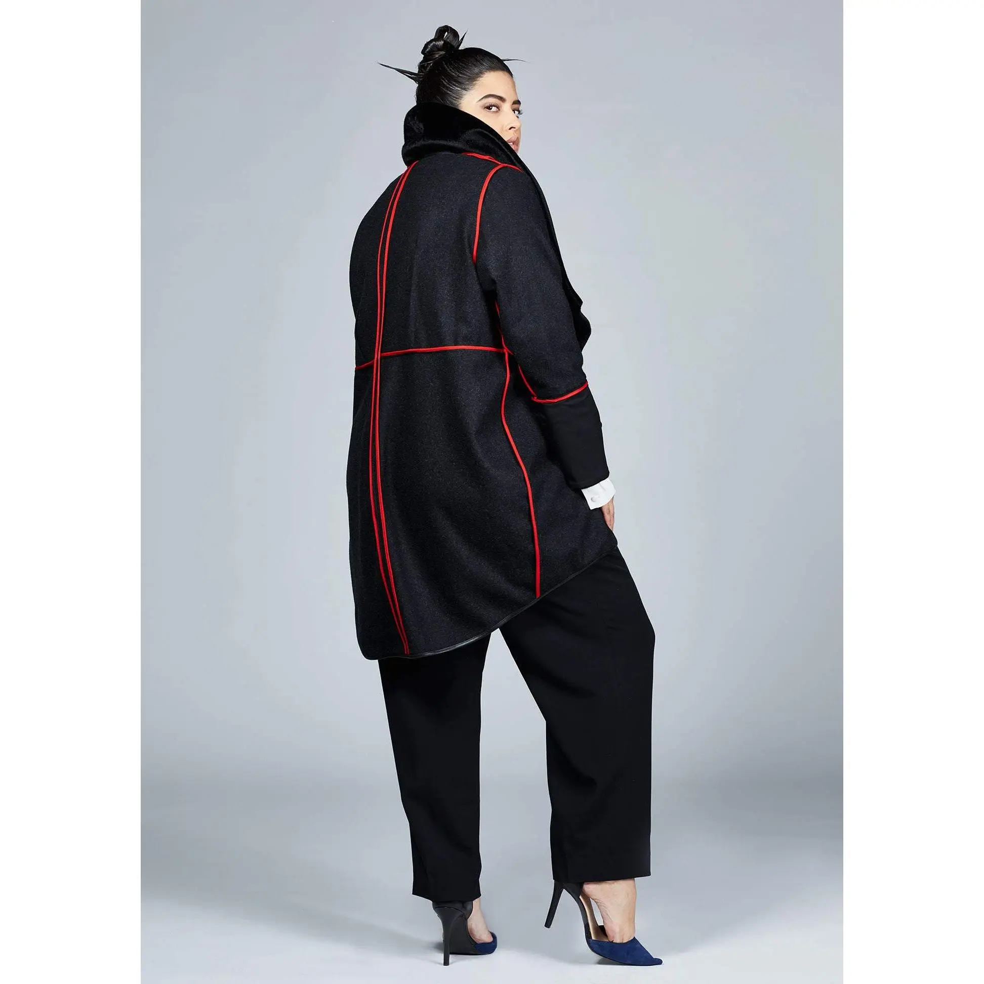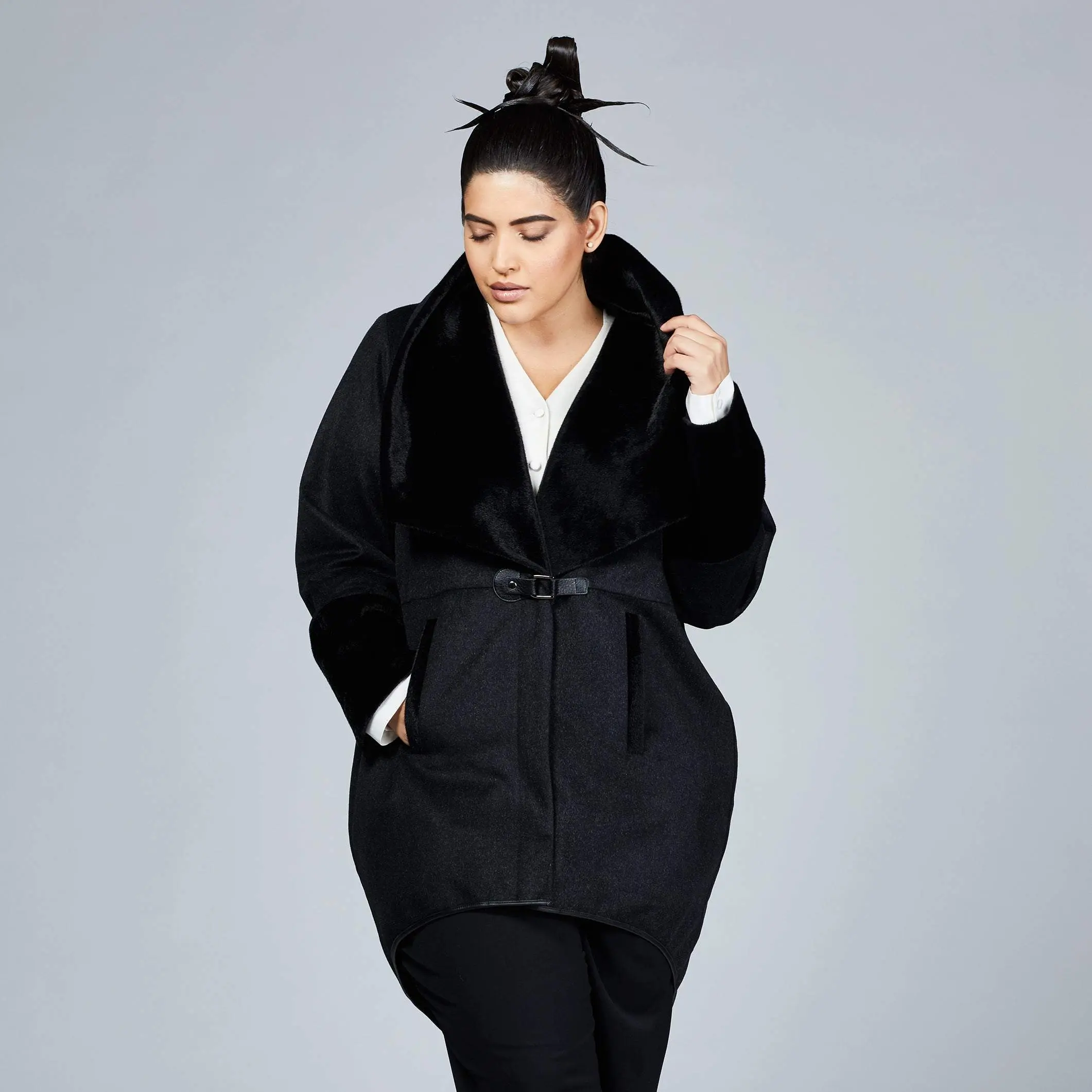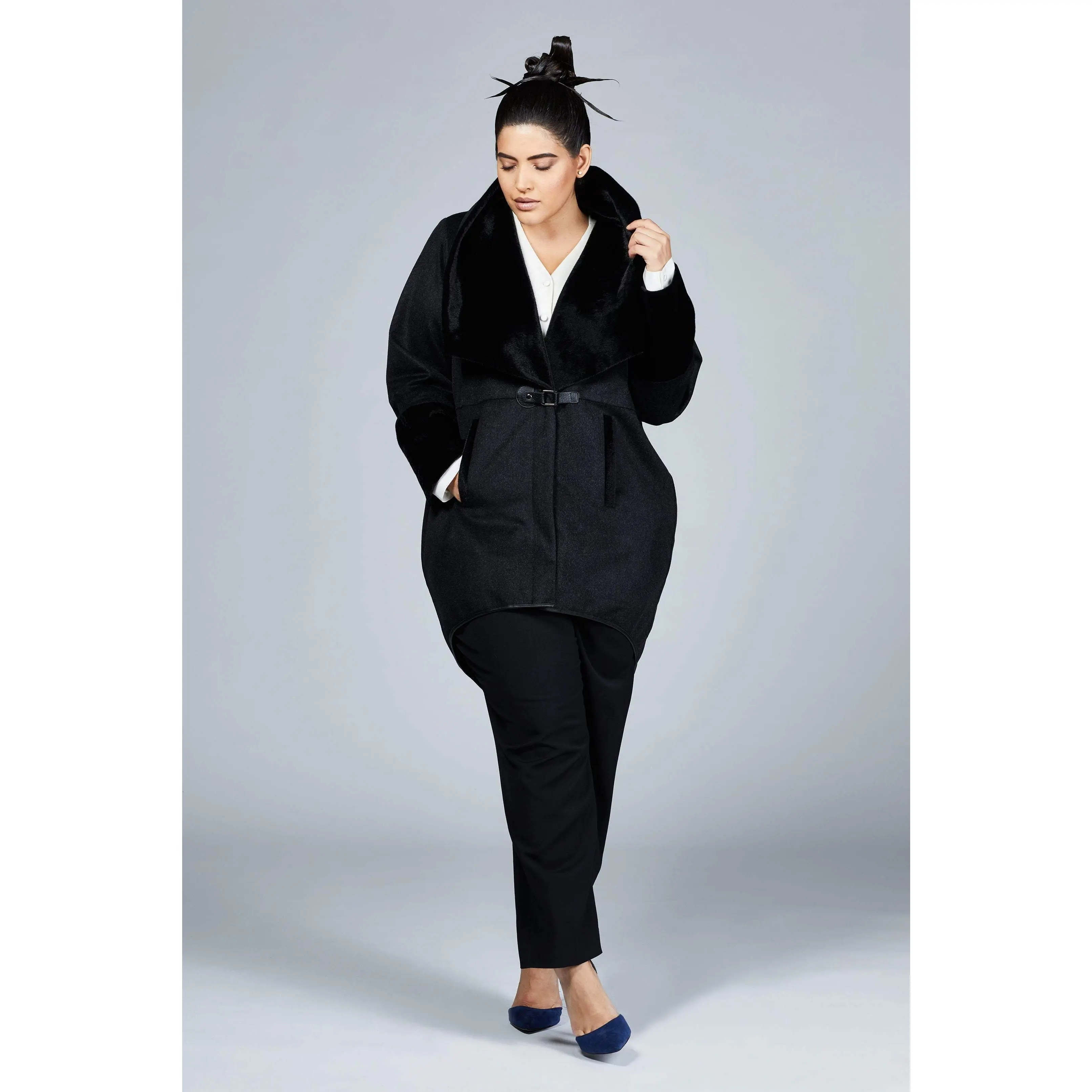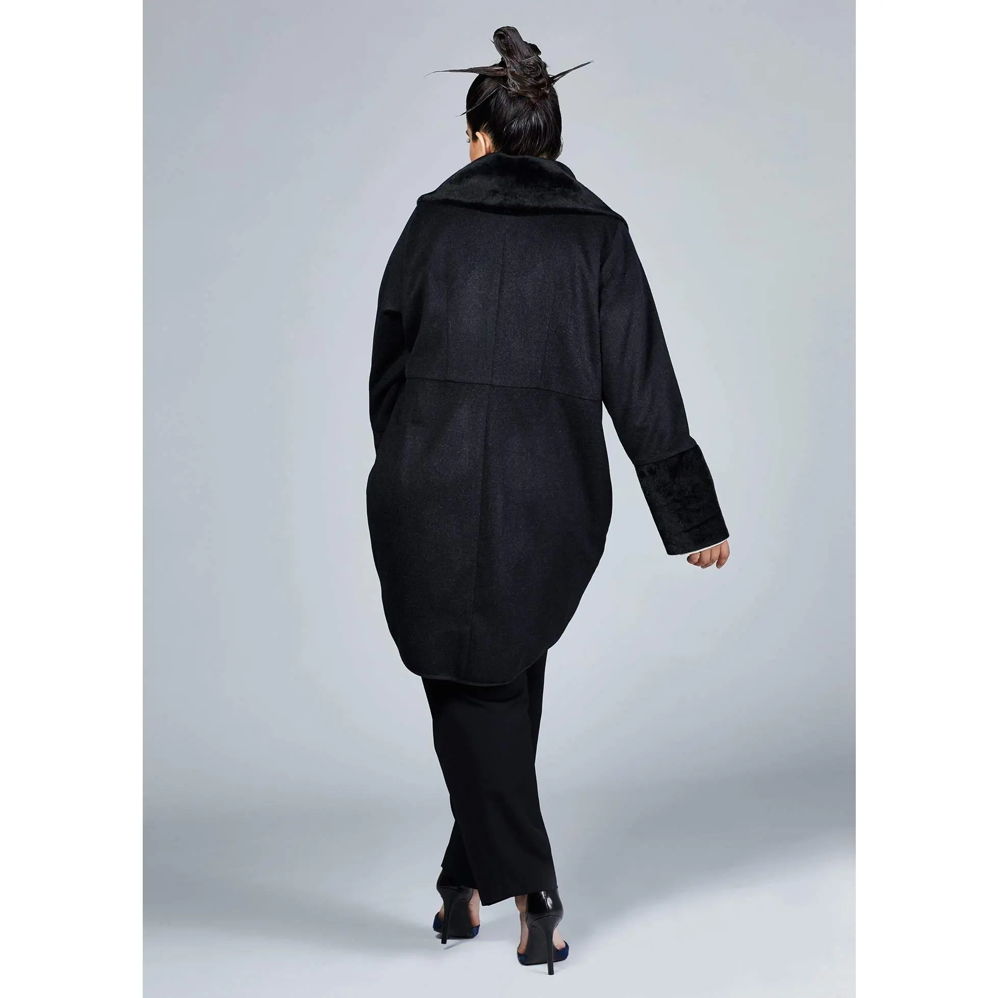 High-end wool blend fabric with vegan fur collar holds the shape of the coat perfectly intact. Concealed zipper closure with a leather tab at front and pockets add ease and comfort to the wearer.Wool Blend
