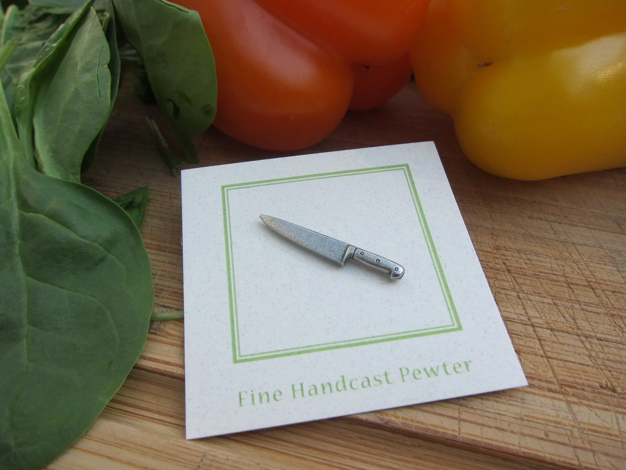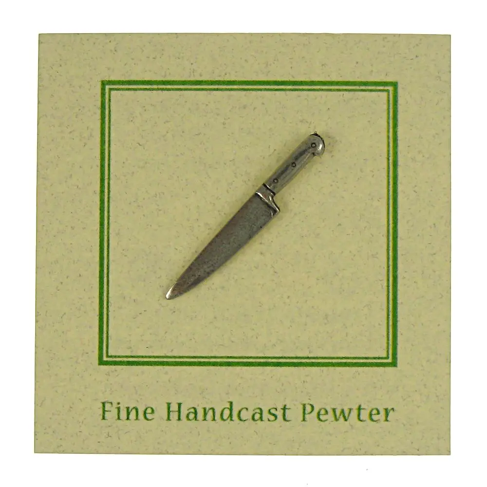 The kitchen knife is the chef's best friend. It is not only indispensable, but also an extension of their body. Celebrate the culinary expert in your life with our hand cast pewter knife pin. All our kitchen and chef pins arrive packaged on our signature presentation card, making them ready for gift-giving! Hosting an event, culinary school graduation ceremony, or opening a new restaurant location? Our custom card option allows you to design the front of the card to include a logo, information about your event, or a special message.