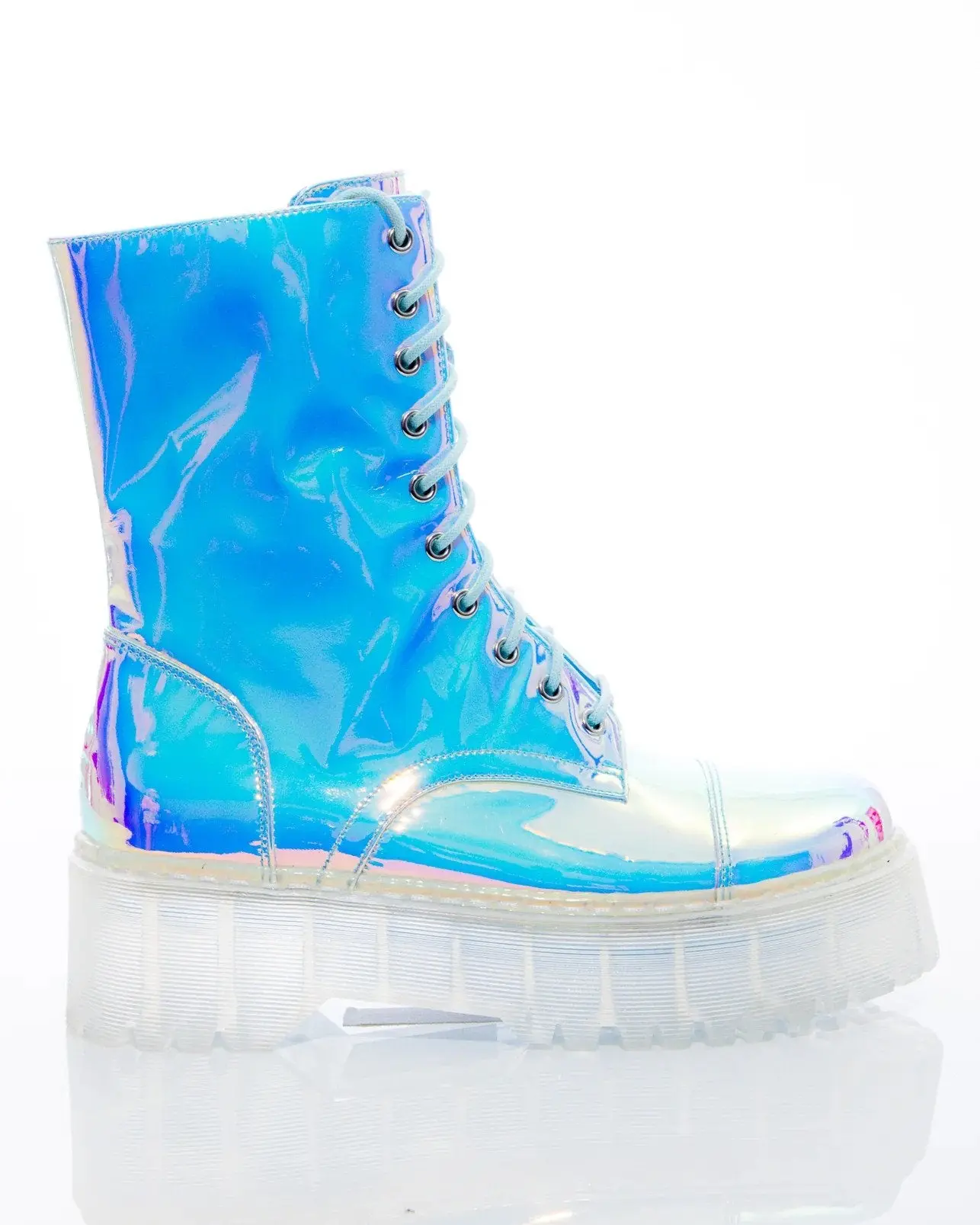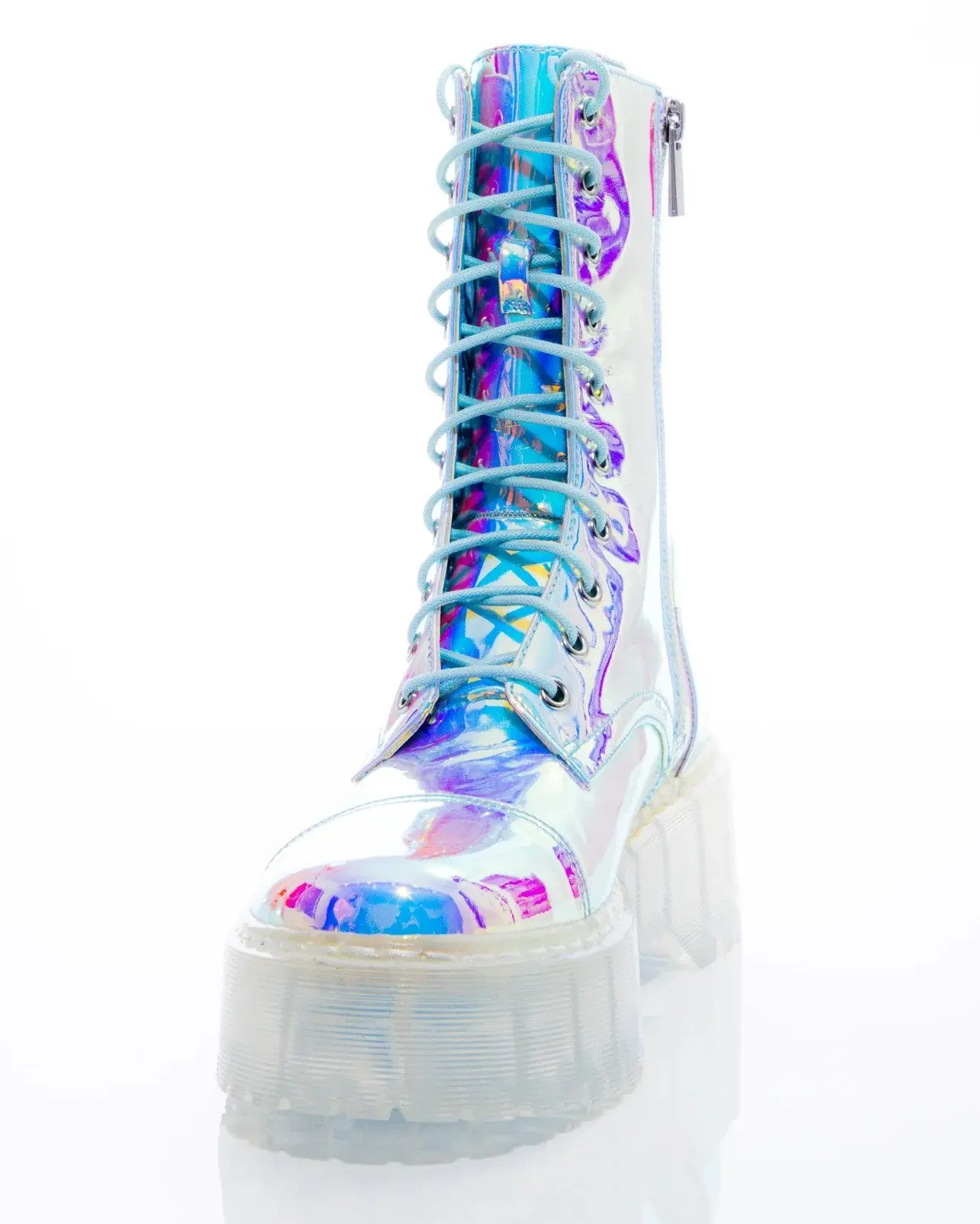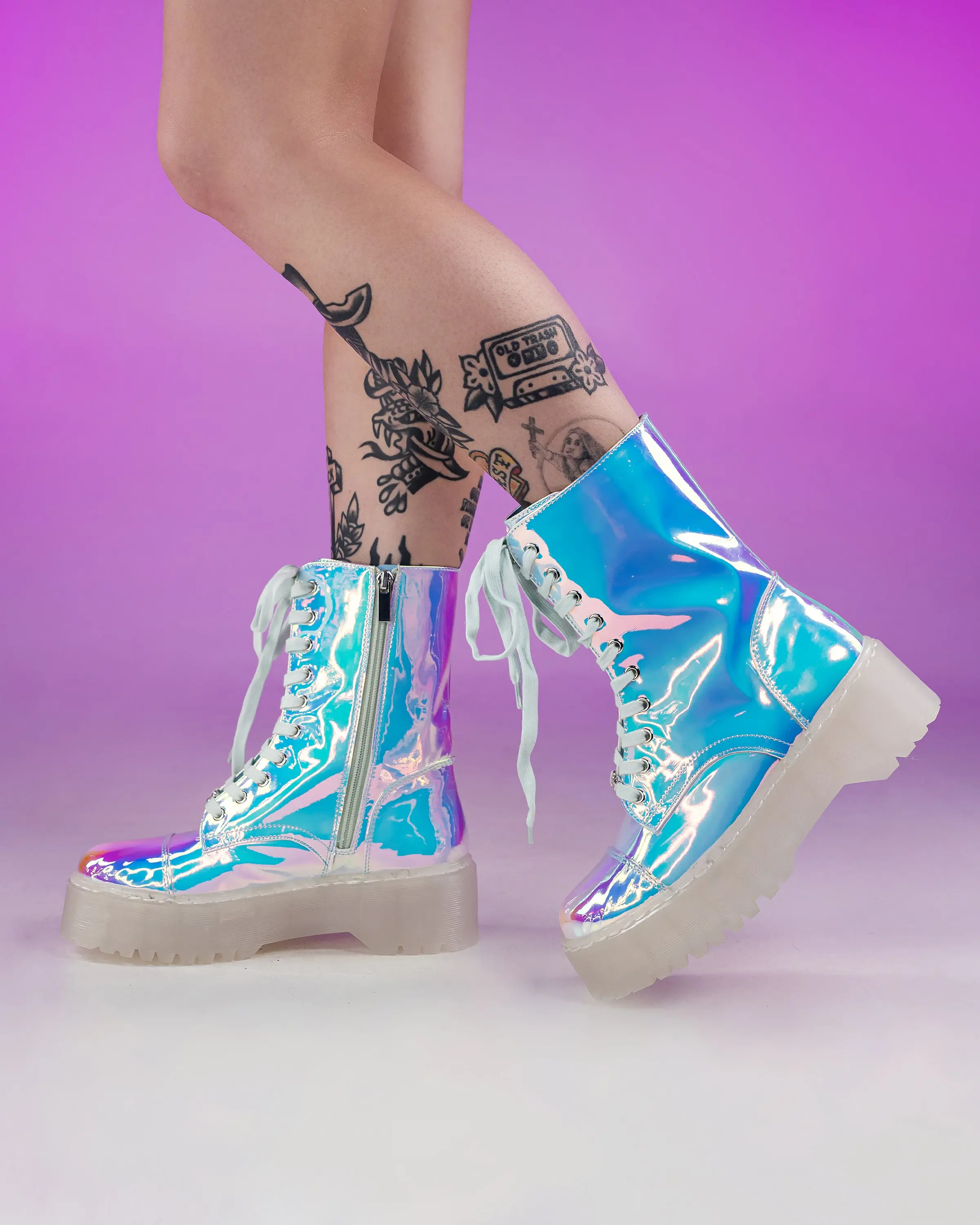 The iridescent rainbow hued design on these boots is sure to take your breath away. With a unique lace up design that is sure to add a personal touch, this boot is a must-have for any fashionista.