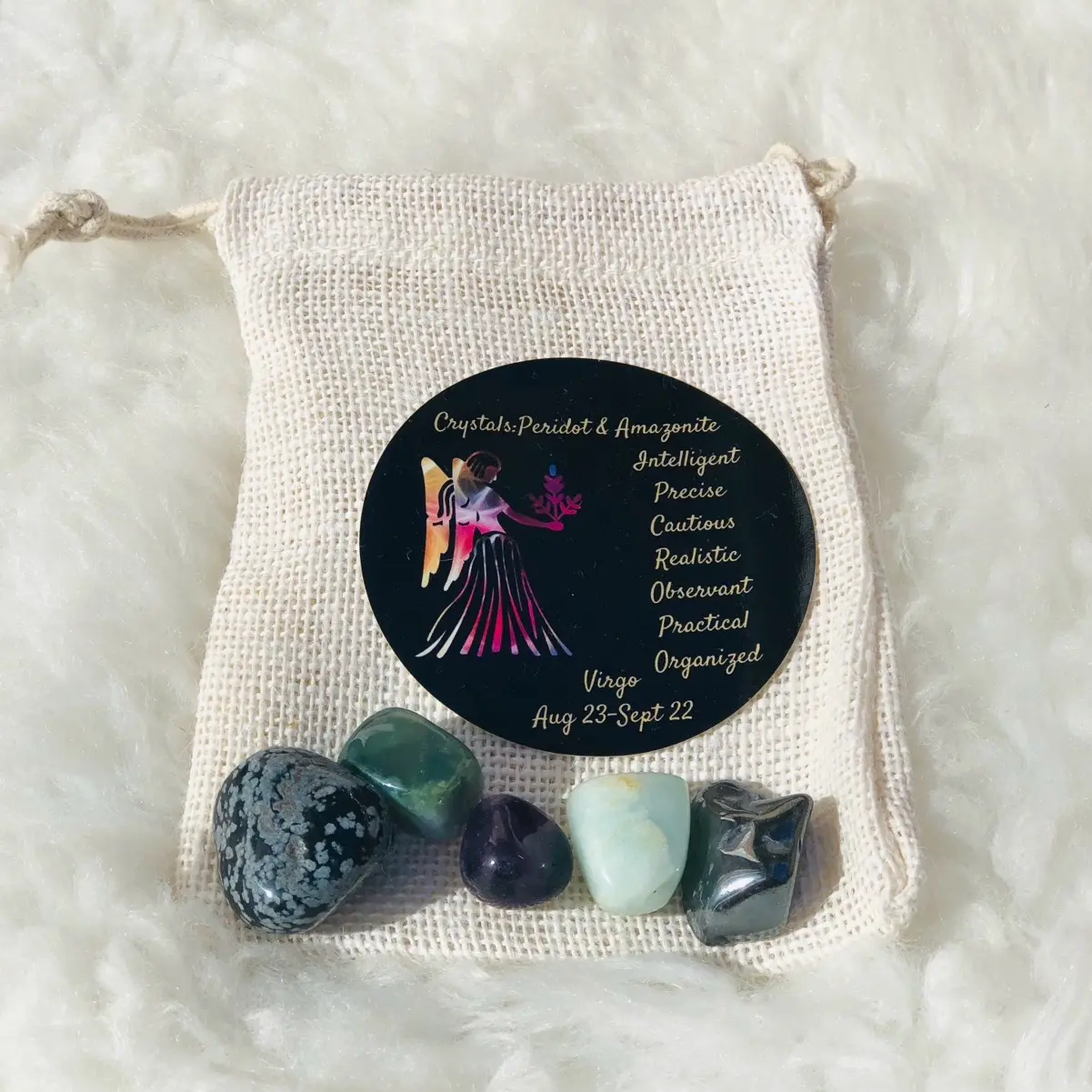 The Virgo crystal set consists of hematite, amazonite, fluorite, snowflake obsidian, and green aventurine. These crystals have been specifically chosen to align with the energy of the Virgo zodiac sign.