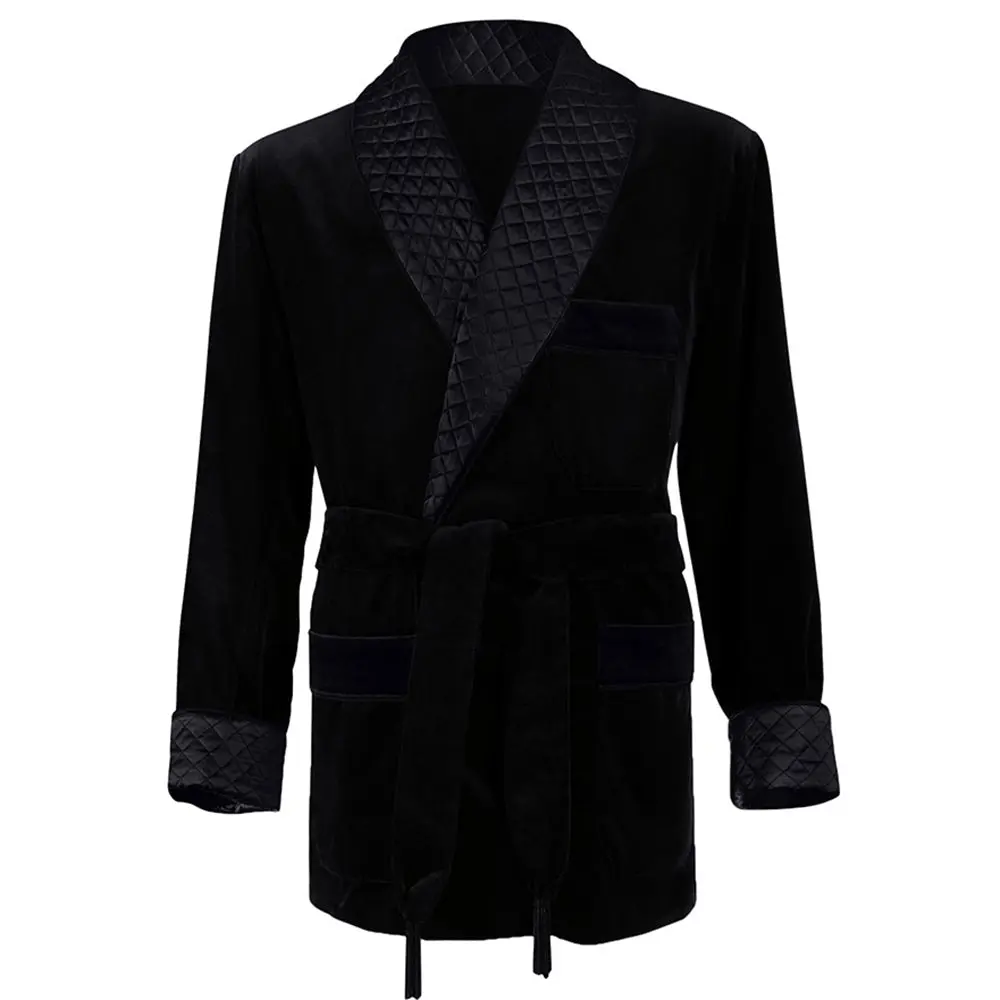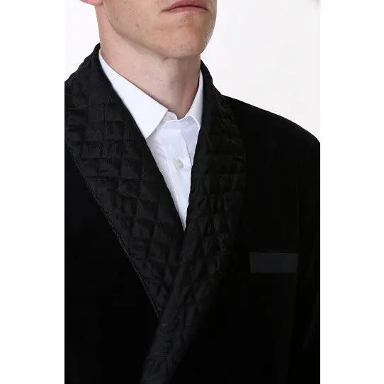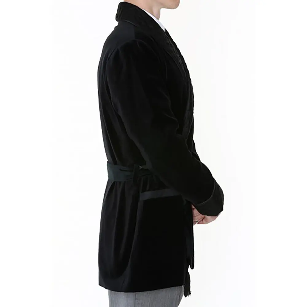 Classic plush black velvet hip length Smoking Jacket made of 100% cotton. Quilted black velvet shawl collar, have black twisted piping cord at edges. There are two deep pockets detailed with black twisted piping cord. The tie belt is held secure by buttons which can be attached to the belt loops. Jacket is fully lined with 100% silk. Perfect for hosting, smoking, lounging & all occasions.