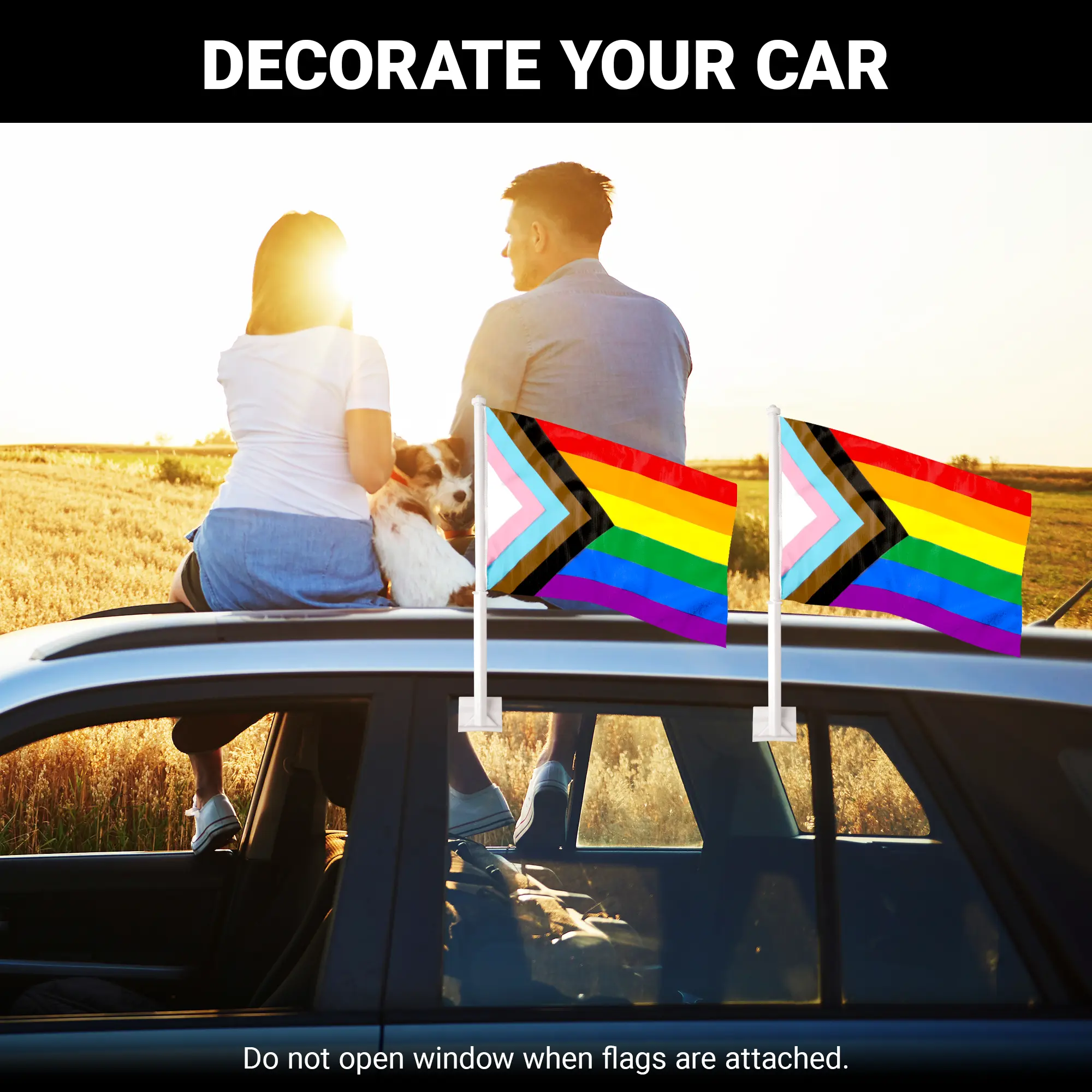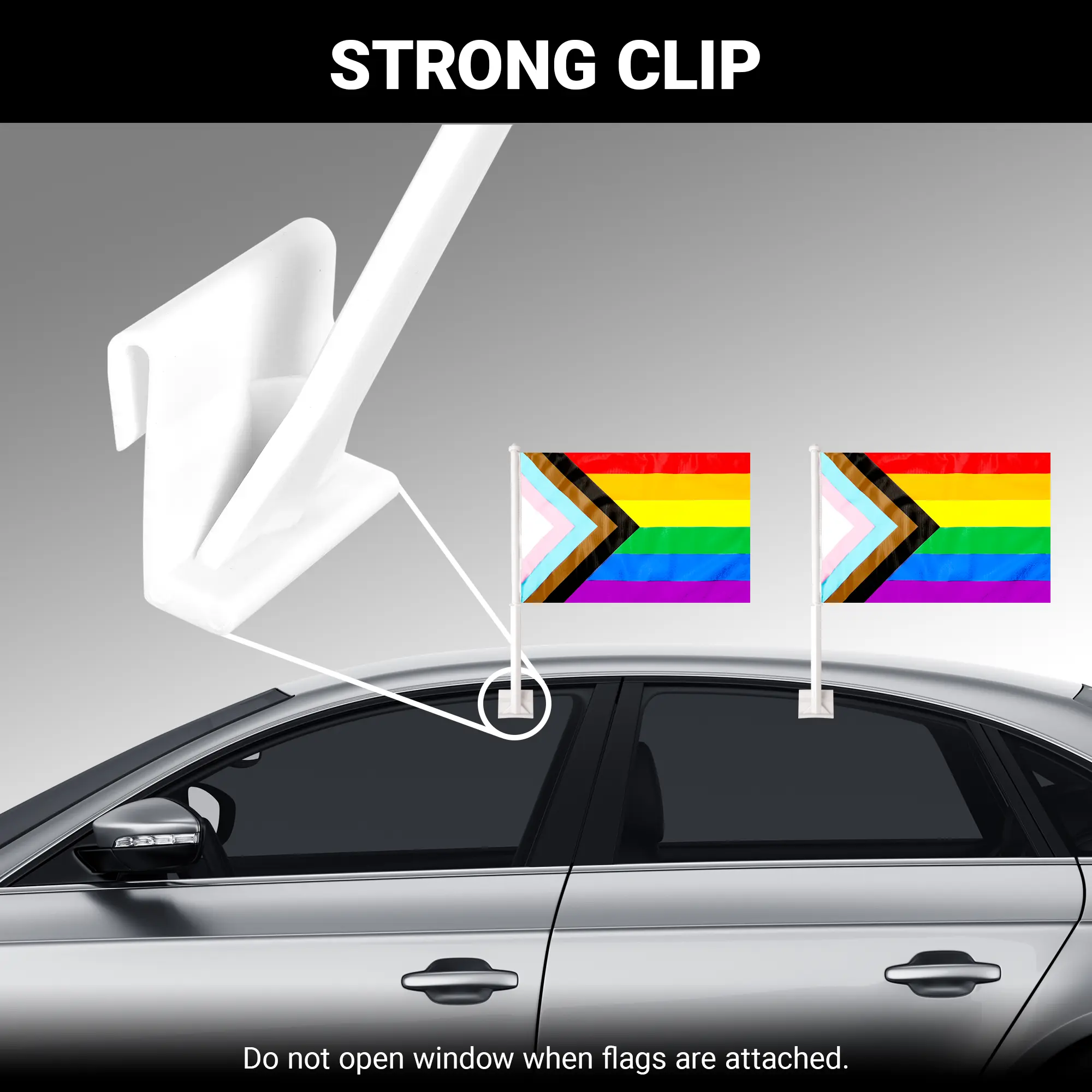 (2) 17″ x 11″ flags and (2) 19.25″ flagpoles with window clip
