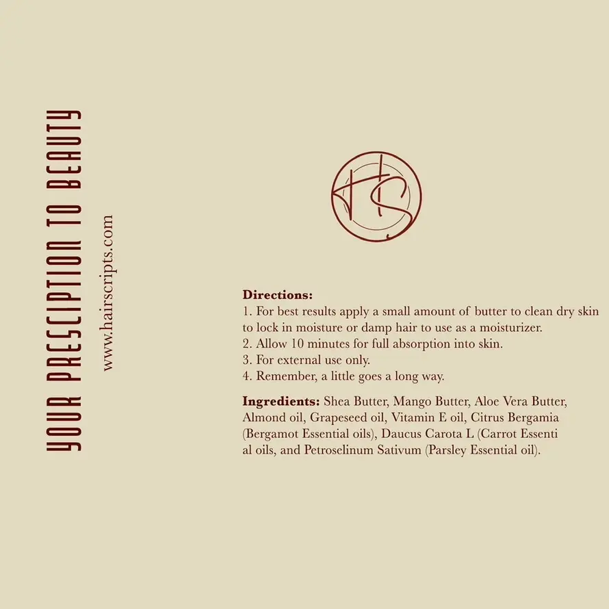 Indulge in the ultimate pampering experience with HairScripts Whipped Body Butter - a luxurious blend of shea, mango, aloe vera and coco butter, infused with vitamin E and essential oils. This silicone-free body butter deeply moisturizes and nourishes your skin leaving it feeling soft and smooth.