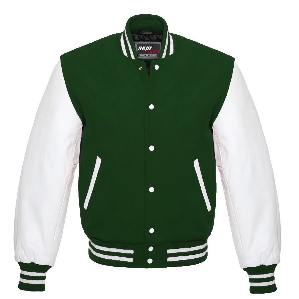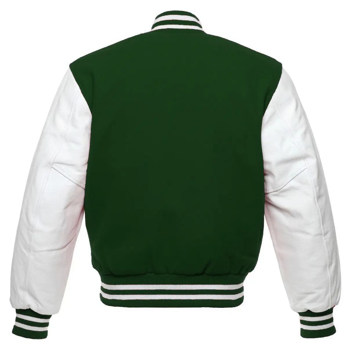 Letterman Varsity Jacket Wool & Real Leather Forest Green/White Collar Knit