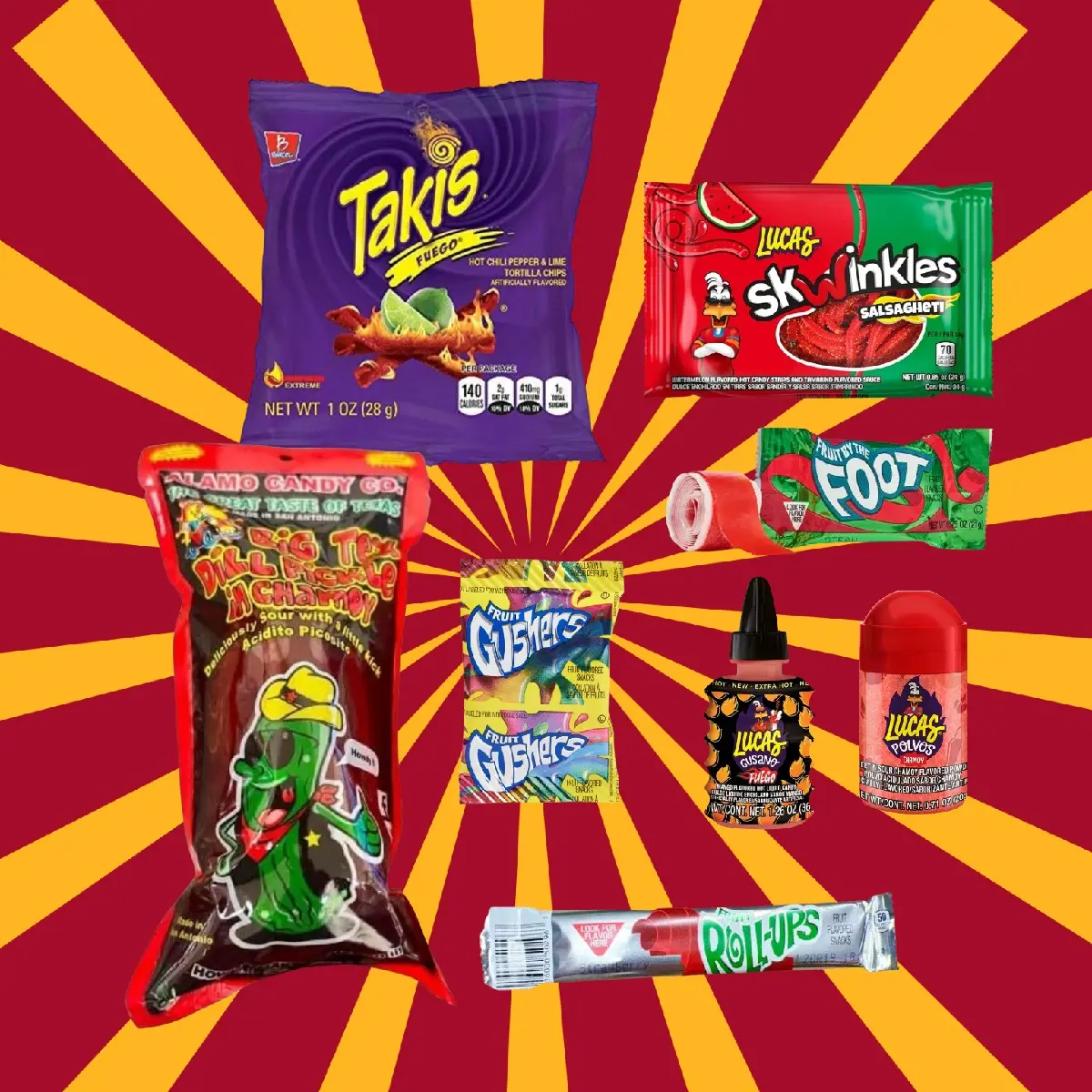 This 8-piece kit includes everything you need to create an authentic Alamo Big Tex Chamoy pickle with a twist. With takis, fruit roll-ups, Lucas skwinkles, Lucas liquid (varies), Lucas powder and gushers - the possibilities are endless!