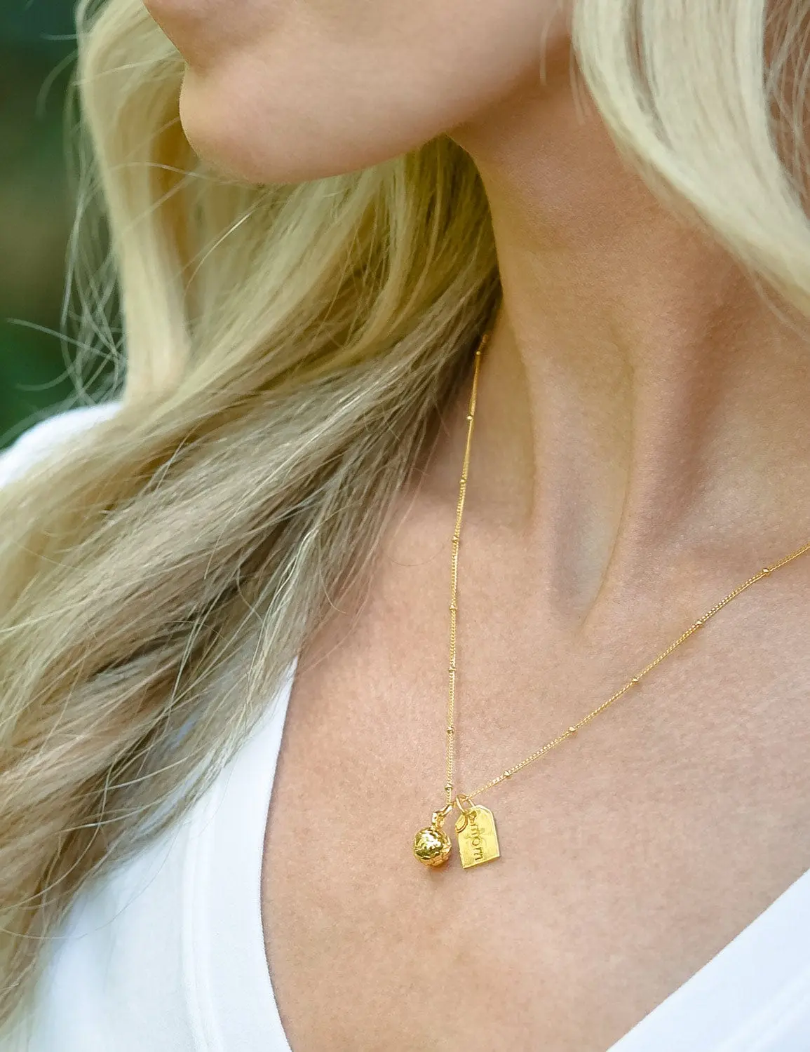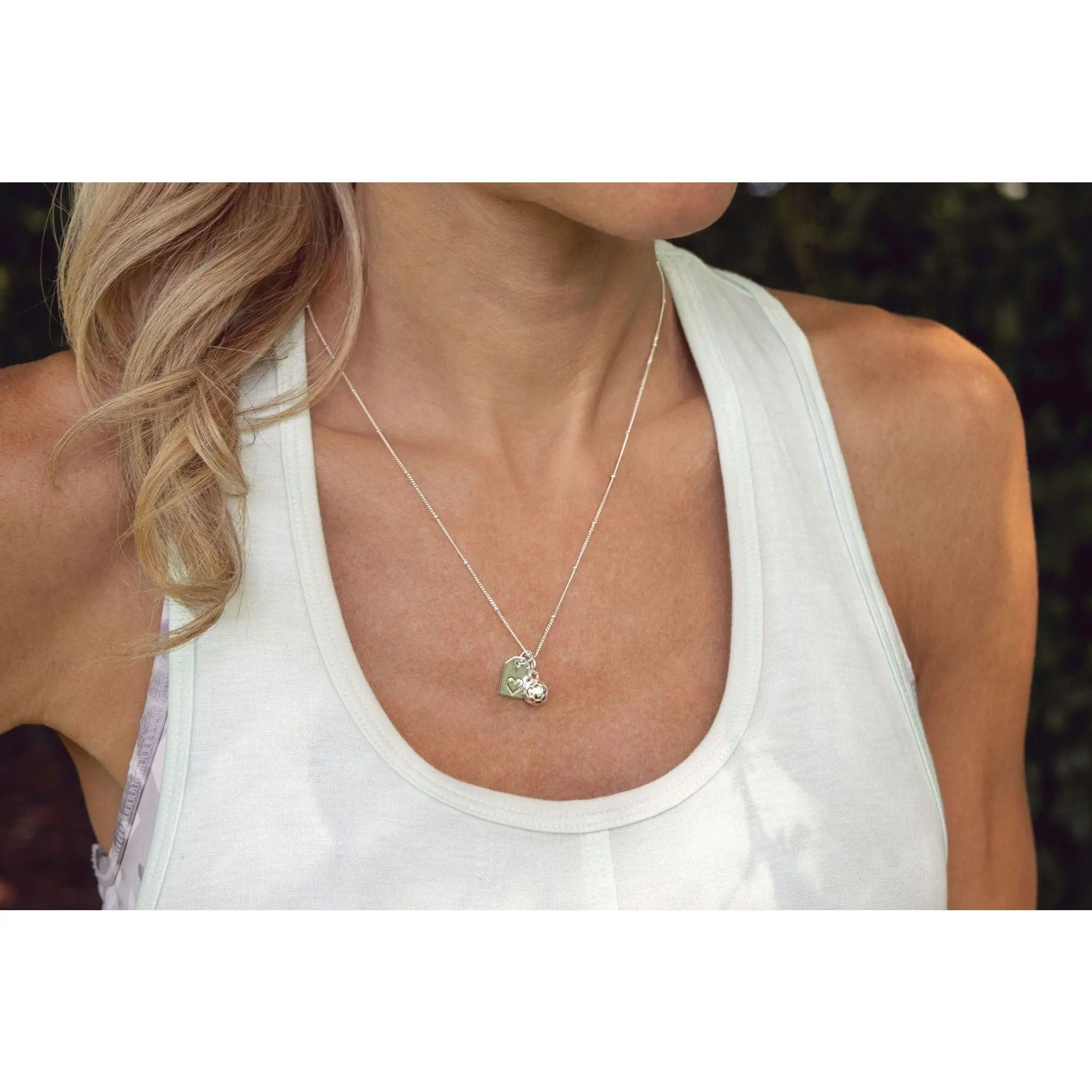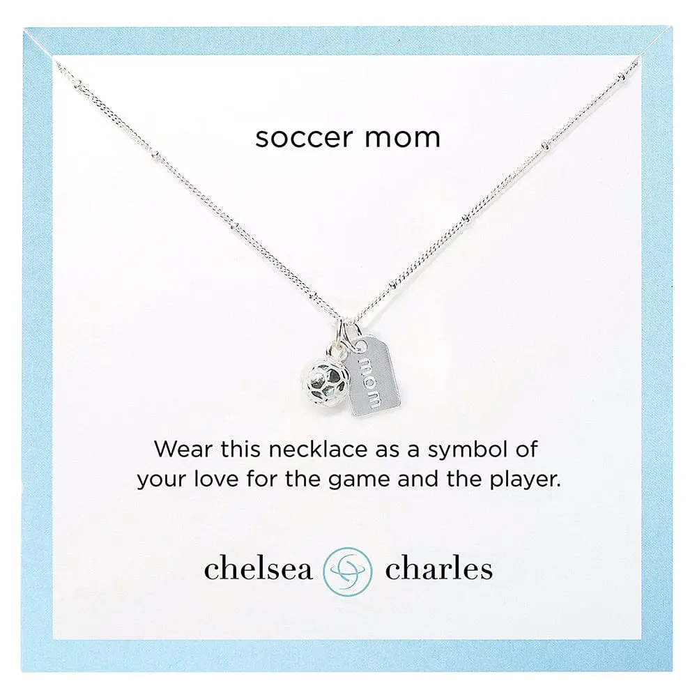 - 14k gold or sterling silver plated soccer ball charm (8mm) and reversible mom tag (.35 x .5") with a signature heart on-the-back