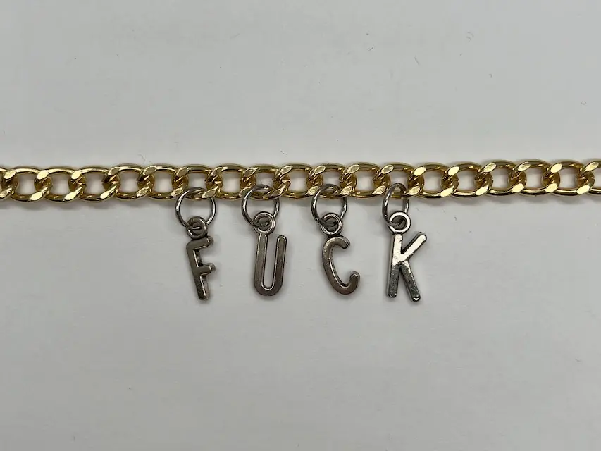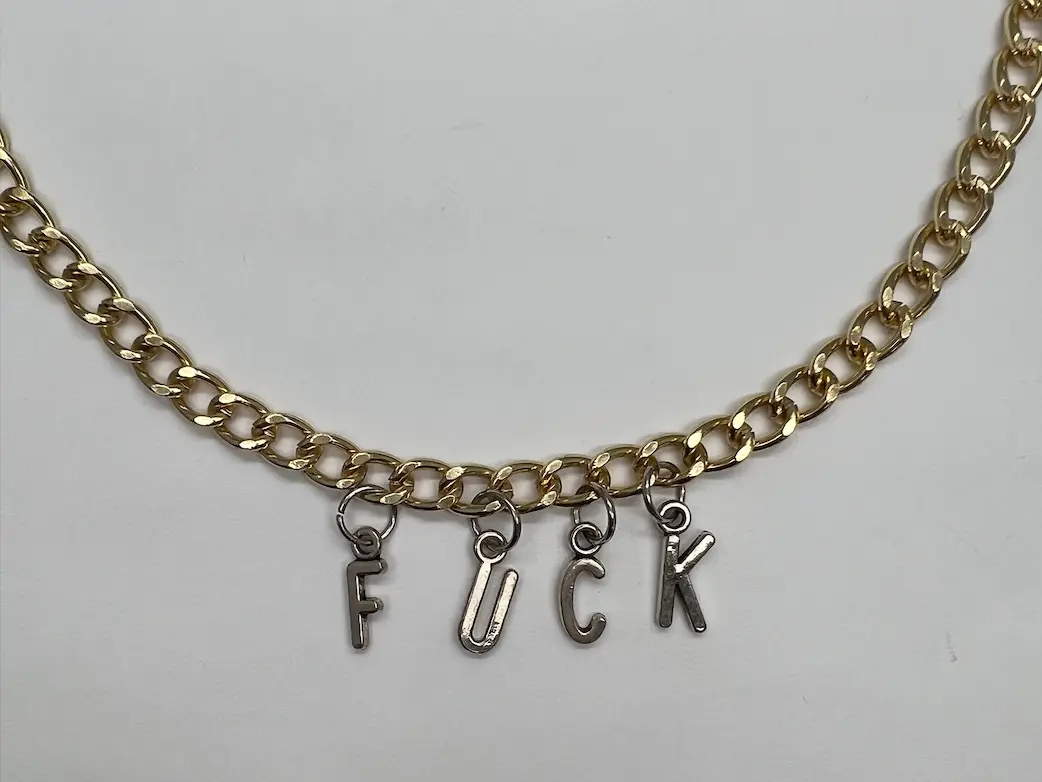 Costume jewelry with a quick-release clasp. Gold chain with silver letters. "FUCK"