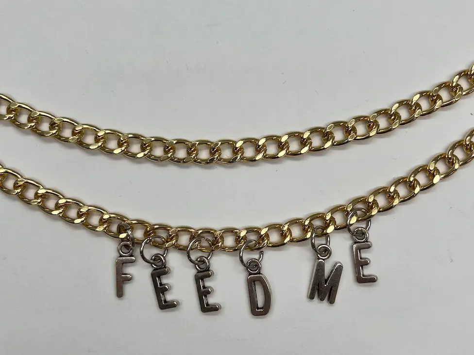Costume jewelry with a quick-release clasp. 2 gold chains with silver letters. "FEED ME". Option for single or double chain.