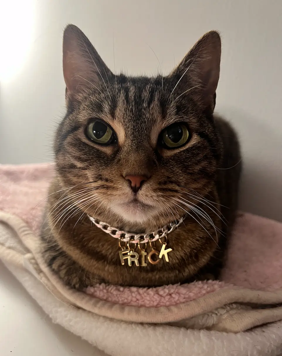 This Pet Collar - FRICK is the ultimate accessory for your furry friend. It is suitable for both dogs and cats, making it a universal pet size. The silver chain with a gold letter adds a touch of style to your pet's look.