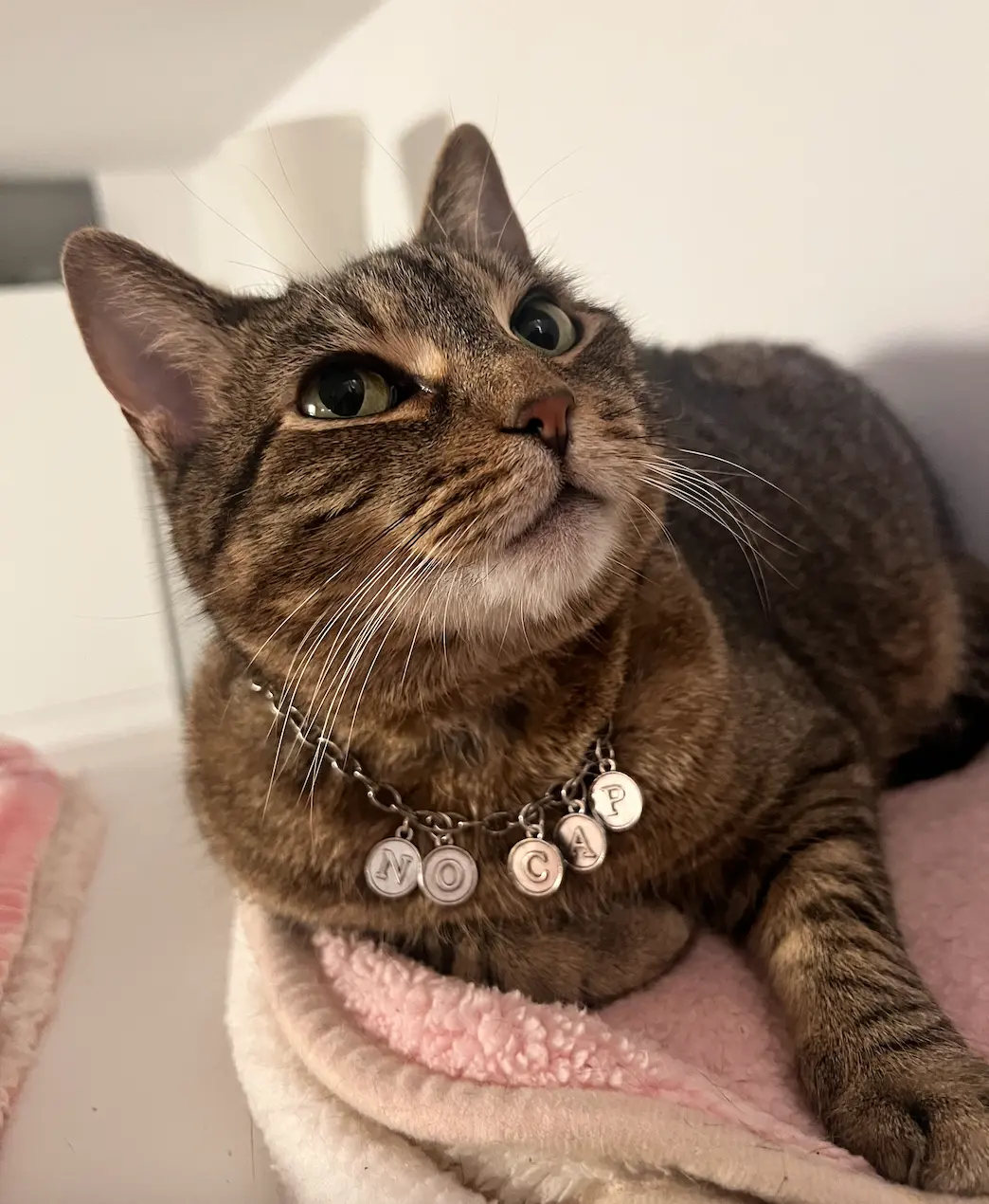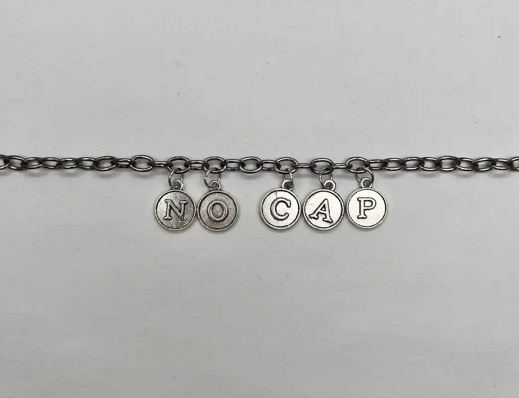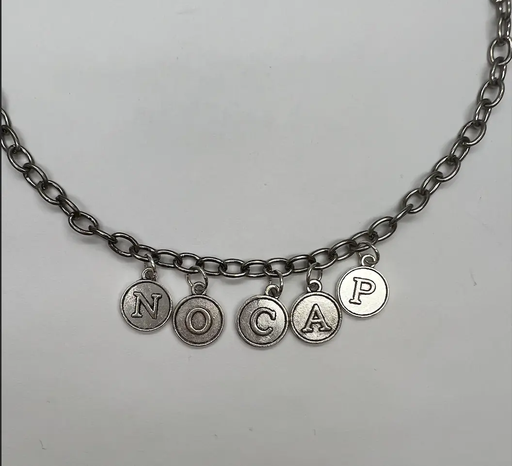 Costume jewelry with a quick-release clasp. Antique silver chain with silver letters. "NO CAP"