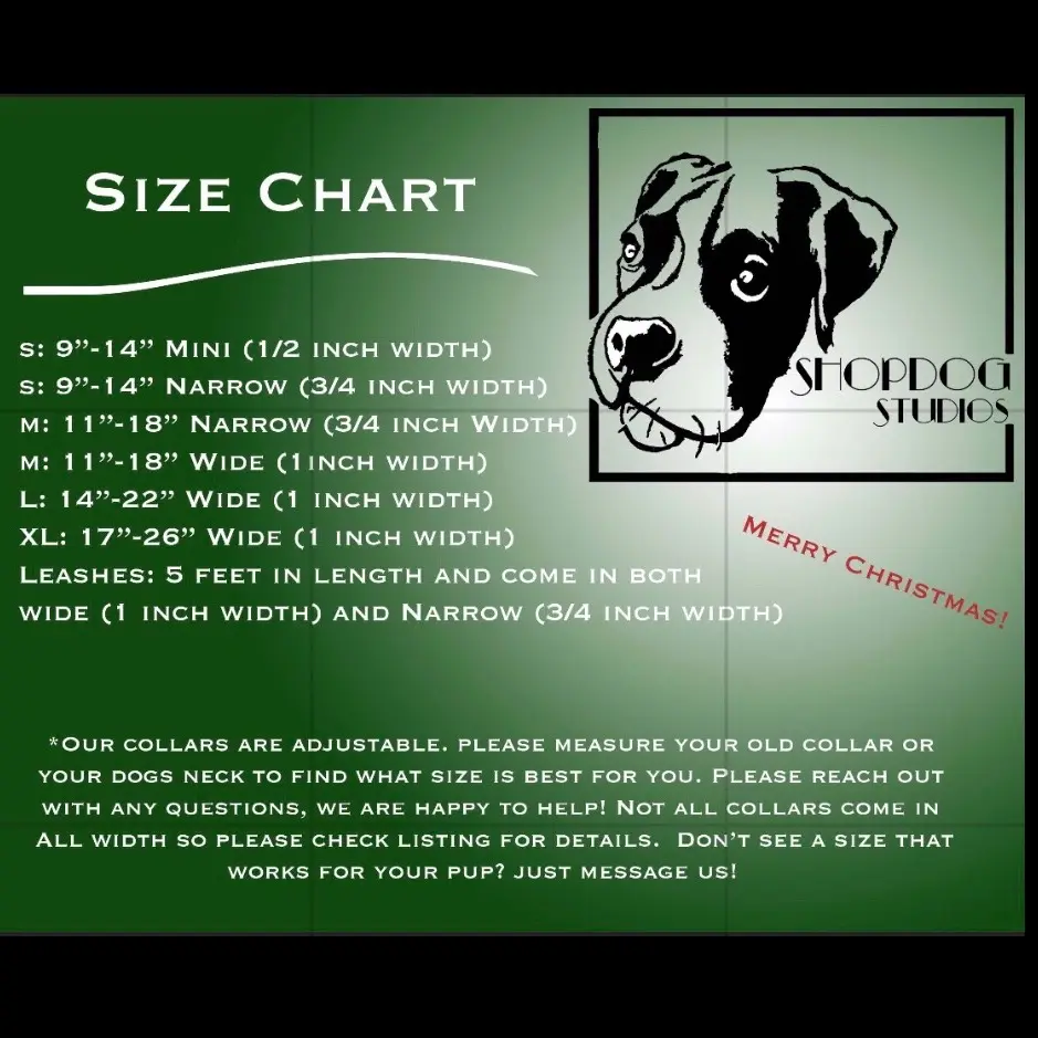 All of Shopdog's Christmas dog collars are made here in our California studio with Vibrant Materials and Durable Hardware, including Nickel Plated Welded D rings for Strength. These collars make great gifts and are perfect for all of Winter!
