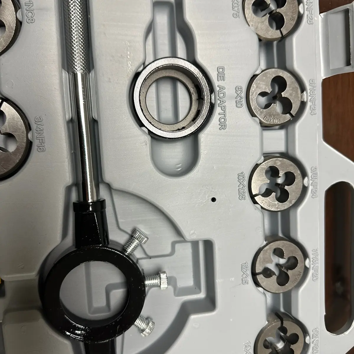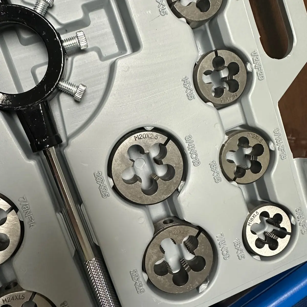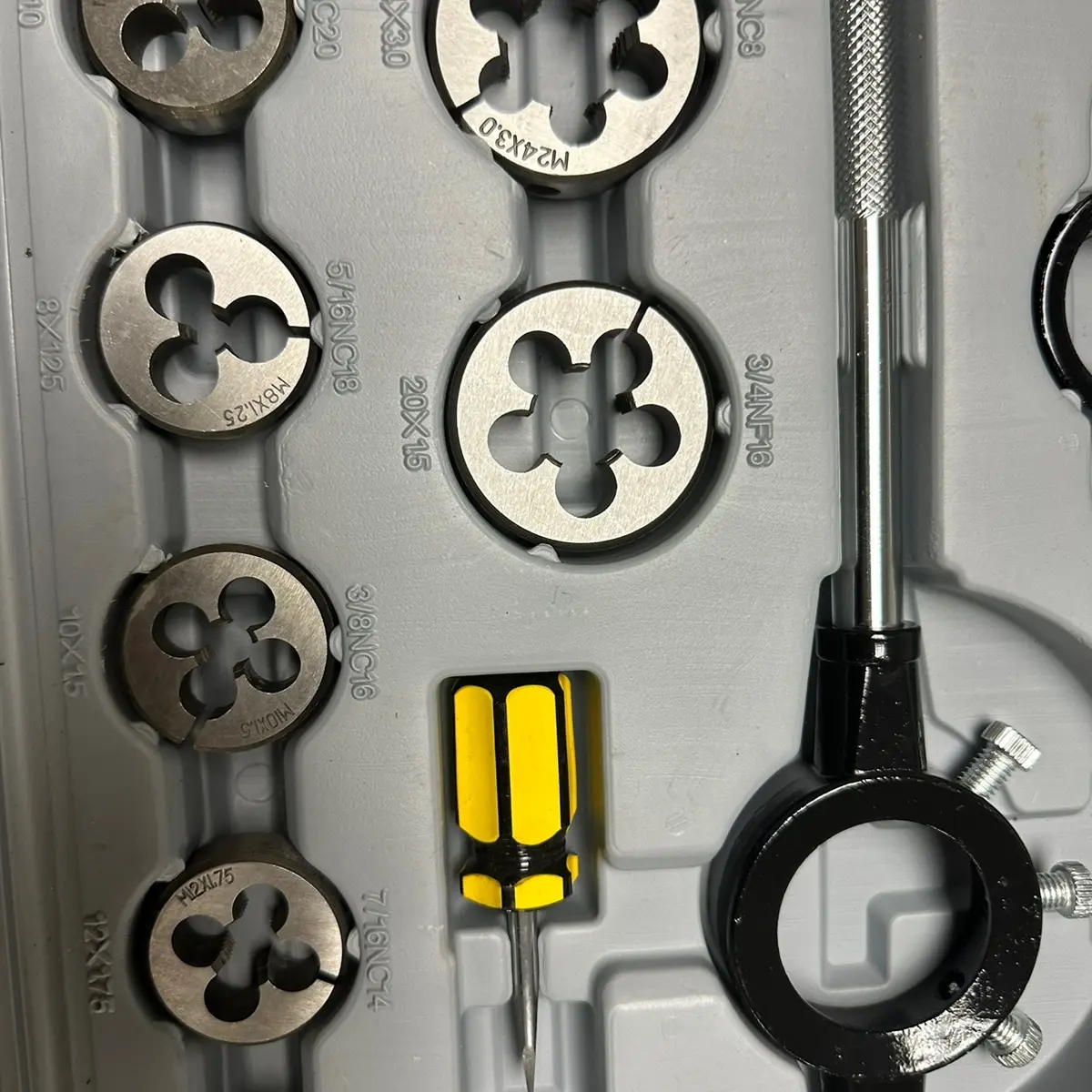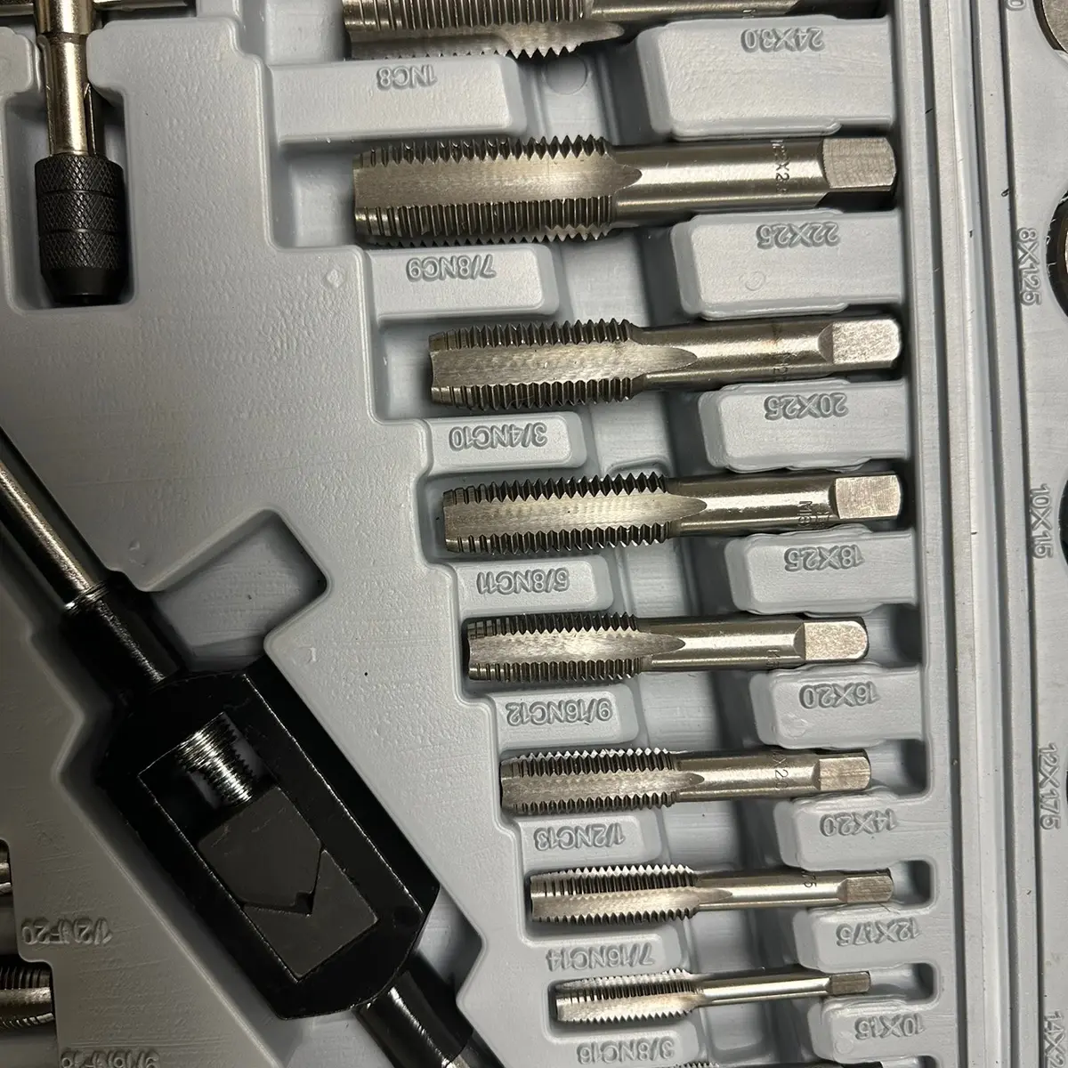 【METRIC SIZE】: M6×0.75, M6×1.0, M8×1.0, M8×1.25, M10×1.25, M10×1.5, M12×1.5, M12×1.75, M14×1.5, M14×2.0, M16×1.5, M16×2.0, M18×1.5, M18×2.5, M20×1.5, M20×2.5, M22×1.5, M22×2.5, M24×1.5, M24×3.0, 20 taps for Internal Threads and 20 Dies for External Threads.
