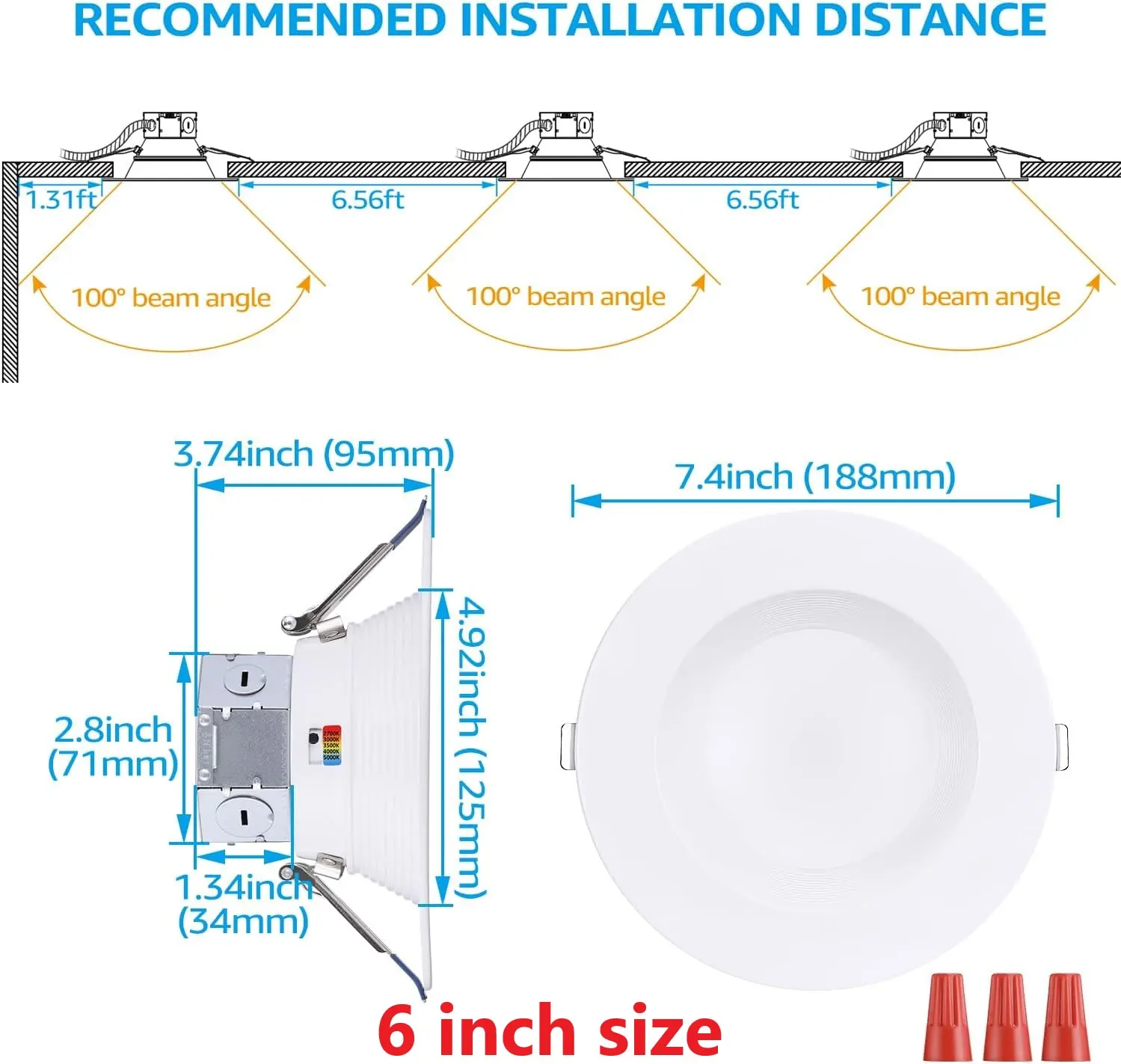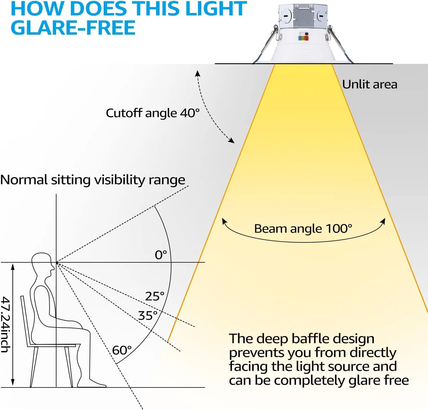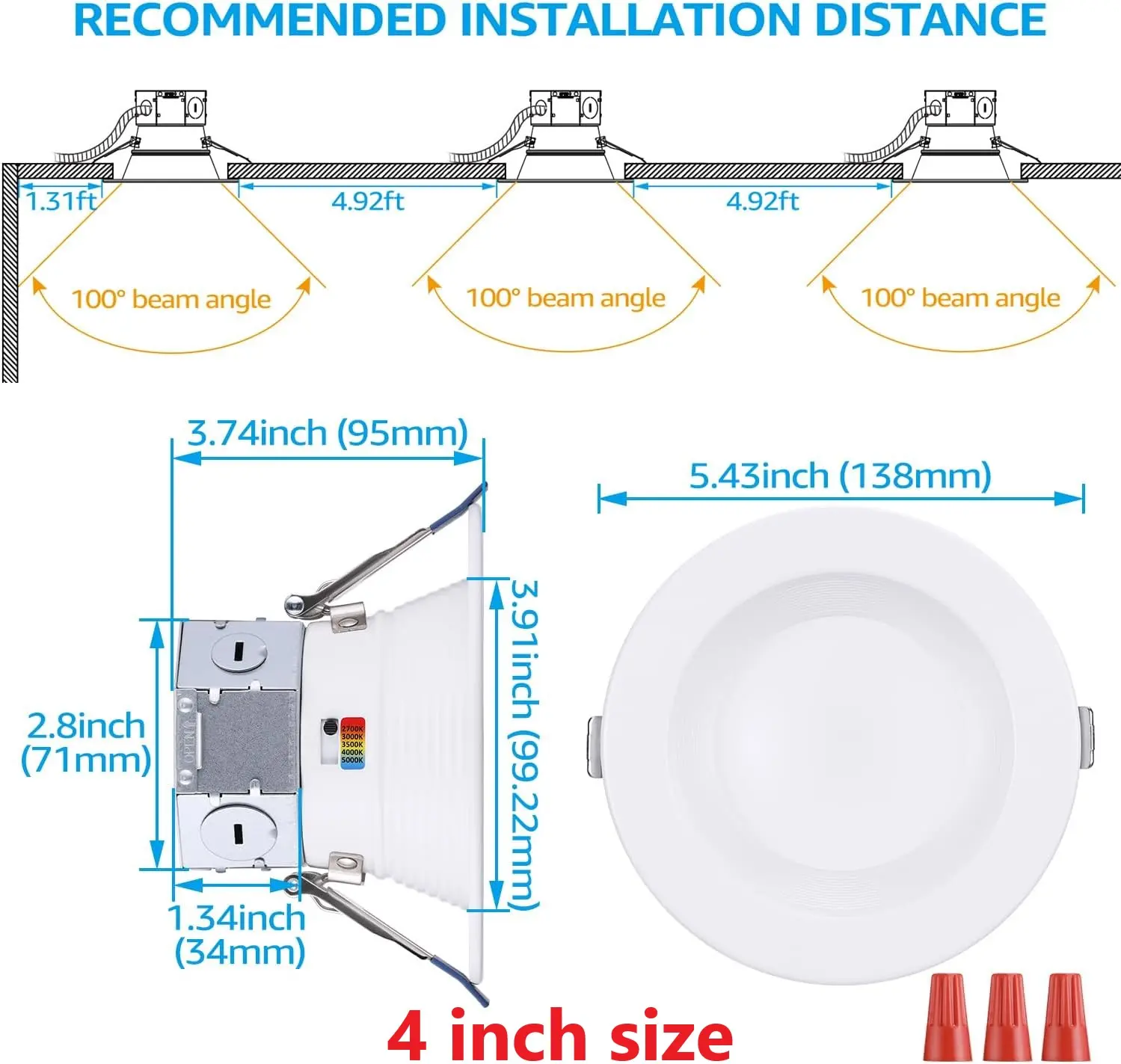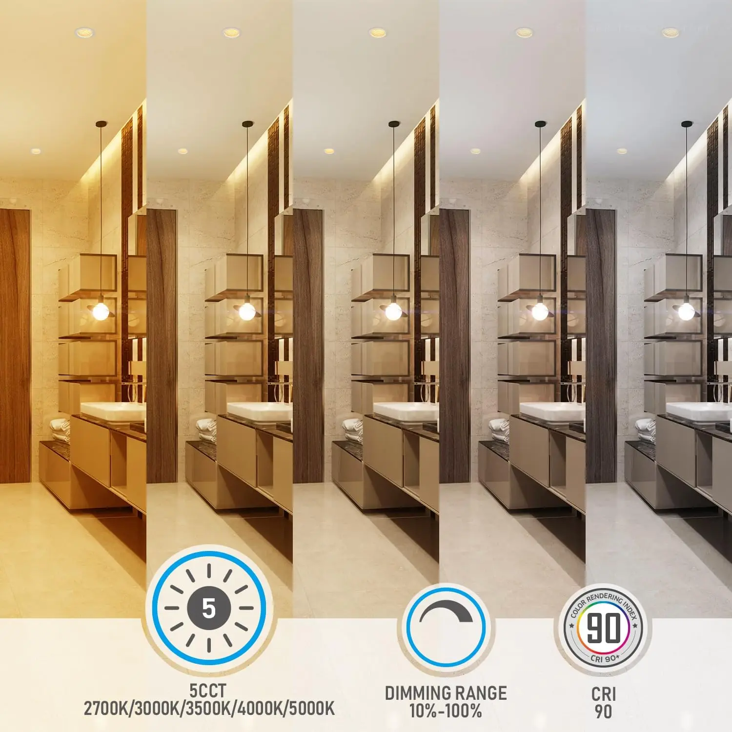 ·5CCT & CRI90 & 10%-100% Dimmable: High CRI90 display the true color of the objects and improve life-quality. Able to change the color temperature (2700K/3000K/3500K/4000K/5000K)from warm lighting all the way to cool lighting, this 5cct canless baffle lights is compatible with most dimmers to achieve smooth 100%-10% dimming
