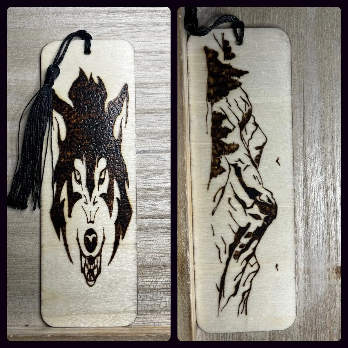 This wooden bookmark features a detailed carving of a wolf and mountain scene, making it the perfect addition for any book lover.