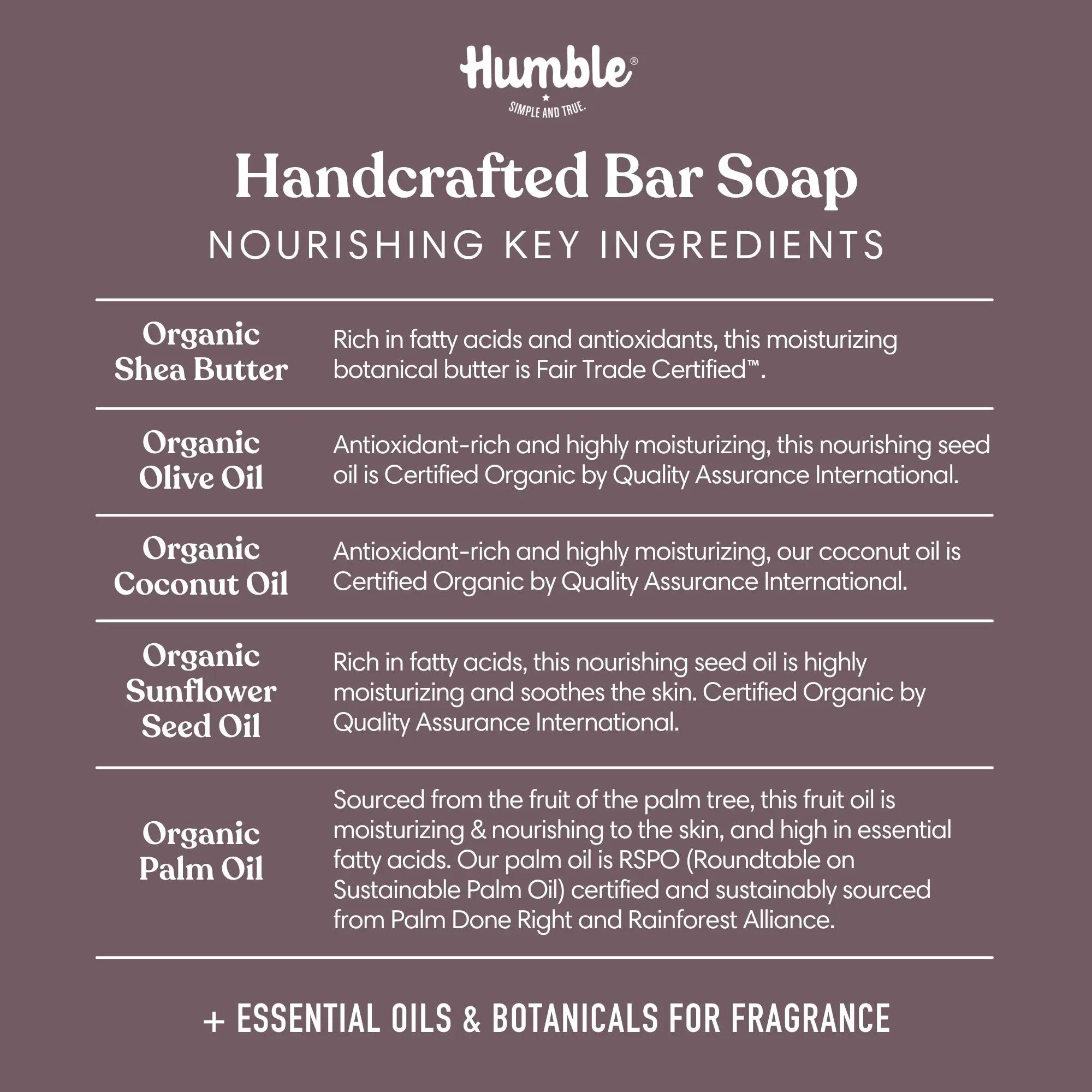 Helianthus Annuus (Sunflower) Seed Oil*, Cocos Nucifera (Coconut) Oil*, Aqua, Sodium Hydroxide**, Elaeis Guineensis (Palm) Oil*†, Carthamus Tinctorius (Safflower) Seed Oil*, Pogostemon Cablin (Patchouli) Leaf Oil, Boswellia Serrata (Frankincense) Oil†, Copaifera Species (Copal) Resin Oil, Dipteryx Odorata (Tonka Bean) Seed Extract, Butyrospermum Parkii (Shea) Butter*^, Olea Europaea (Olive) Oil*, Rosmarinus Officinalis (Rosemary) Leaf Extract