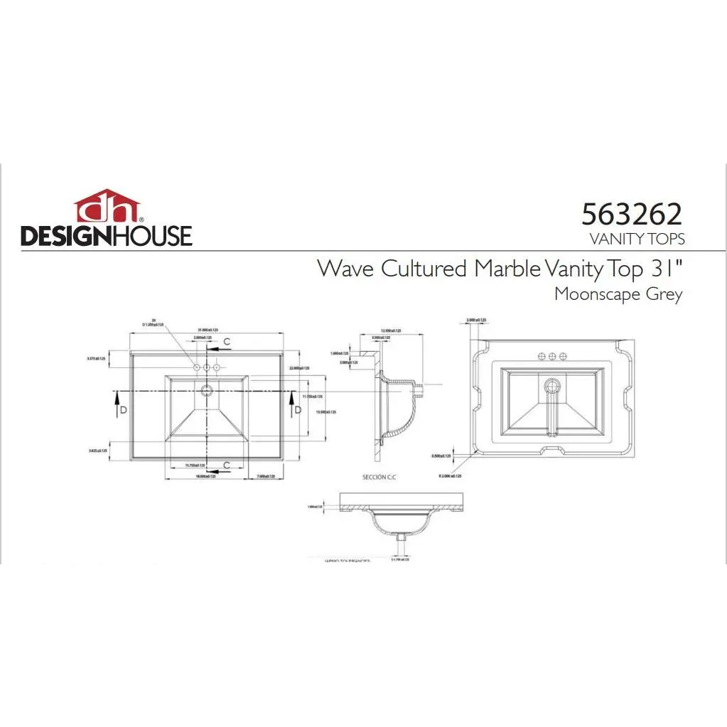 The Design House 563262 Wave Bowl Premium Cultured Marble Vanity Top with integrated 4-Inch Backsplash gives your bathroom a stylish, versatile look. This vanity top measures 31-inches long by 22-inches wide, and comes in a moonscape Gray color that is sure to complement the rest of your bathroom’s décor. There are 3 pre-drilled holes, allowing for a 4-inch center mount faucet. The backsplash helps prevent mold and water damage. The Design House Wave Bowl Premium Cultured Marble Vanity Top with 4-Inch Backsplash comes with a 5-Year limited warranty, so you can be confident in the quality of your vanity top.