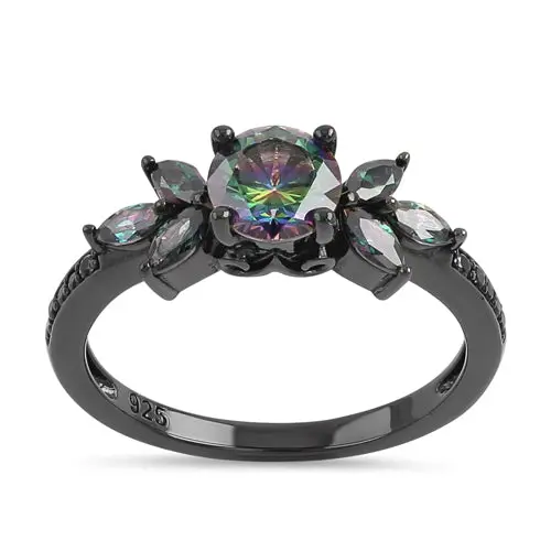 Sterling Silver Black Rhodium Flower Rainbow CZ Ring