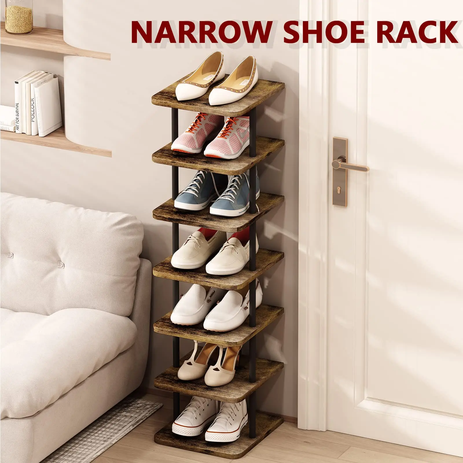 ·【Versatile Vertical Shoe Tower】: A total of 7 open shelves provide ample storage space for shoes in an organized manner, keeping shoes at a glance. It can be used to store shoes as well as other small items that need daily use, such as towels, sundries, books and plants.