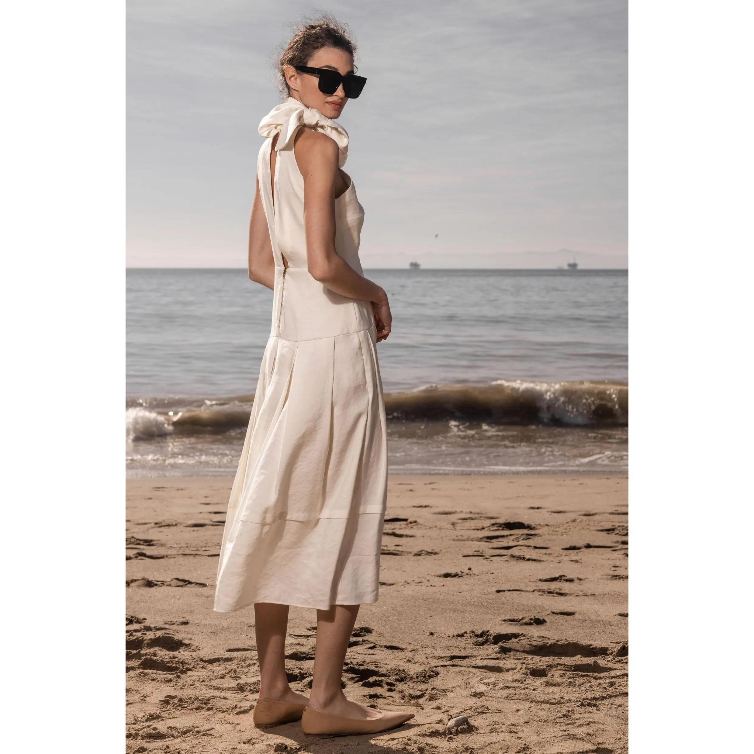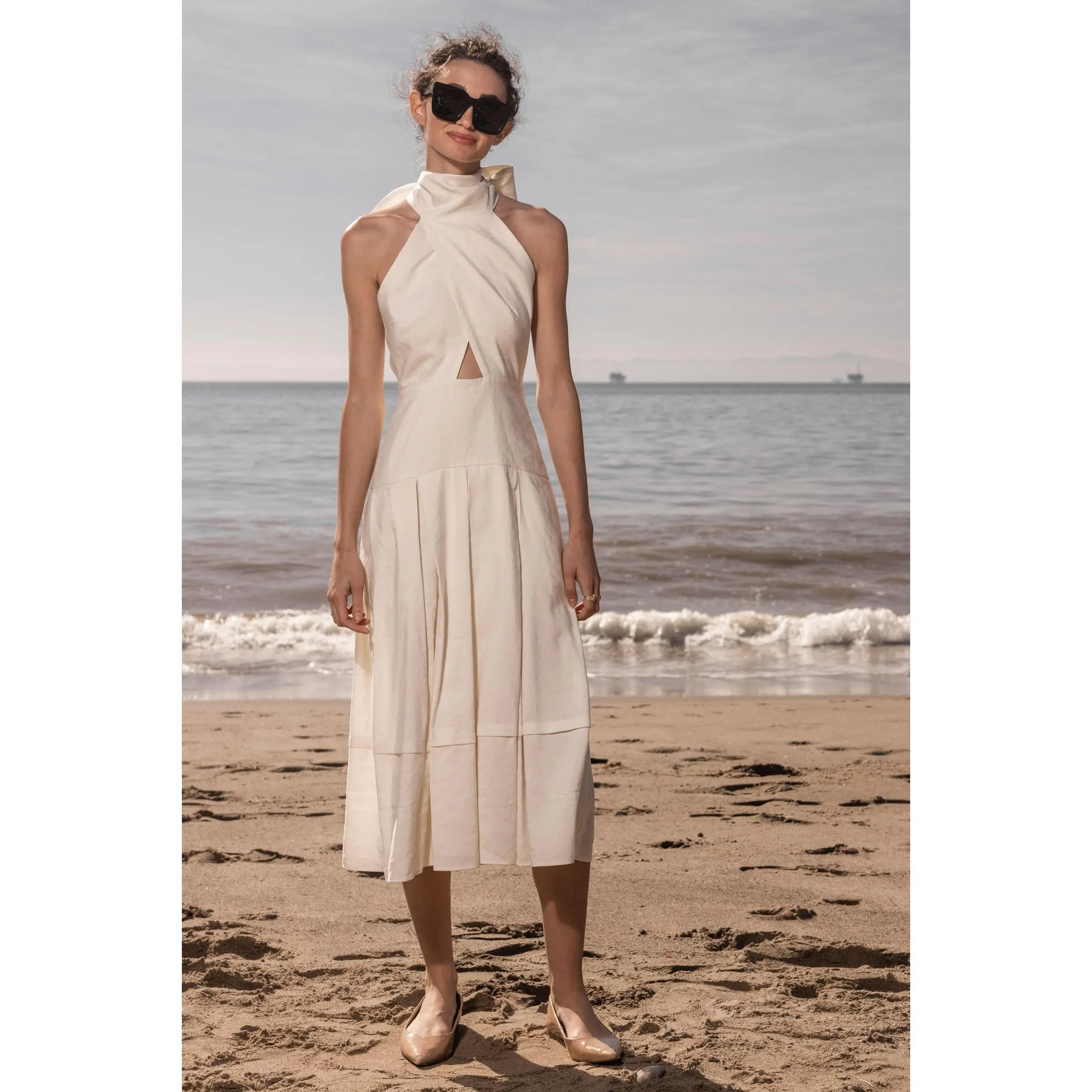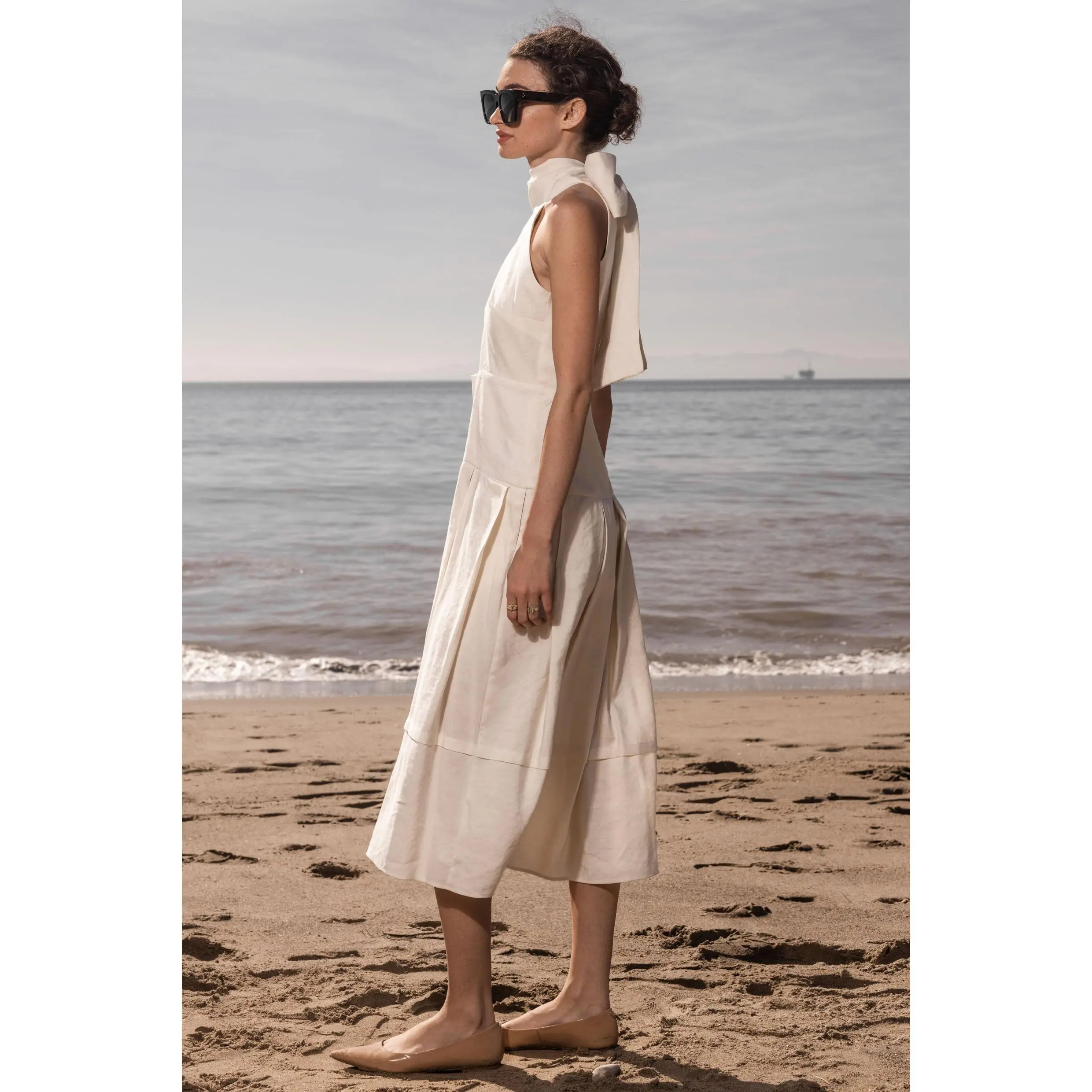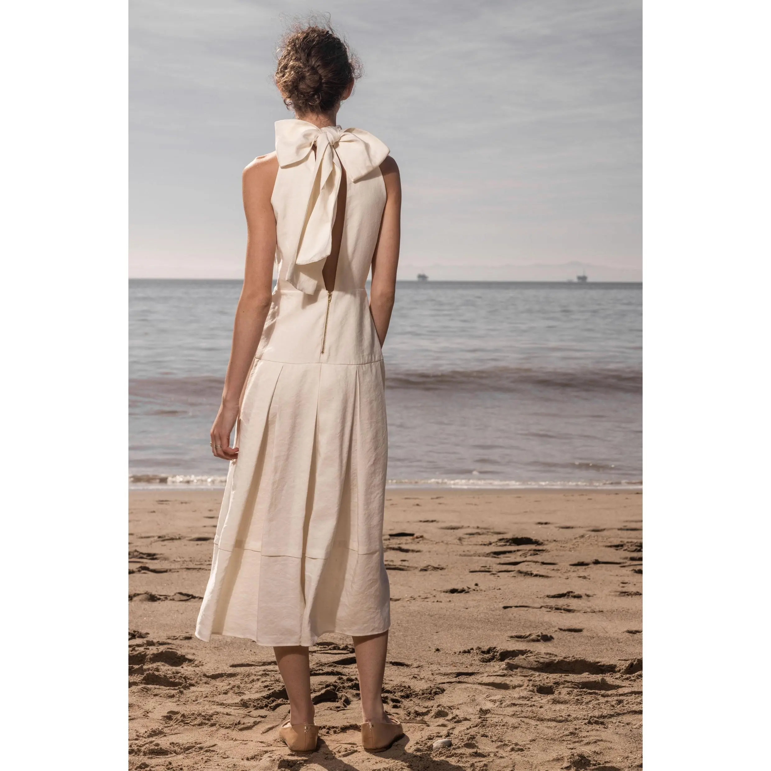 The GINGER dress has a folded halter top and long scarf collar that can be tied on the side or in back. The drop waist skirt is pocketed and pleated, swinging with you and with the wind. If you are short waisted, we recommend to size down. Shop it in Ivory or Noir silk & hemp.