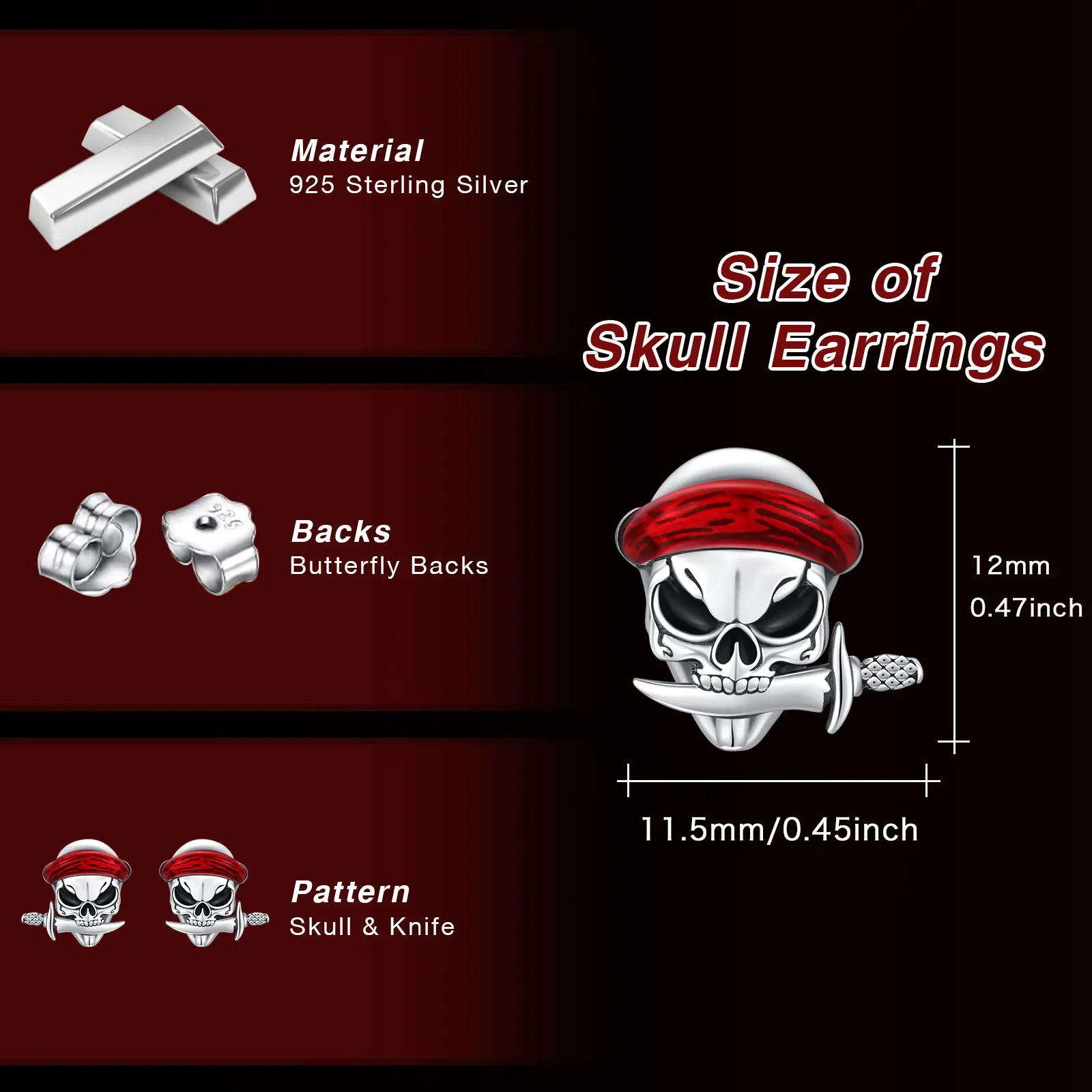 ·925 STERLING SILVER MATERIAL -- Skull earrings made of real 925 sterling silver, the material we used has low sensitivity,leaf-free and nickle-free, won't turn your ears green or itchy them. each pair of earrings comes with the stamp" S925" as the symbol of guaranteed product quality.
