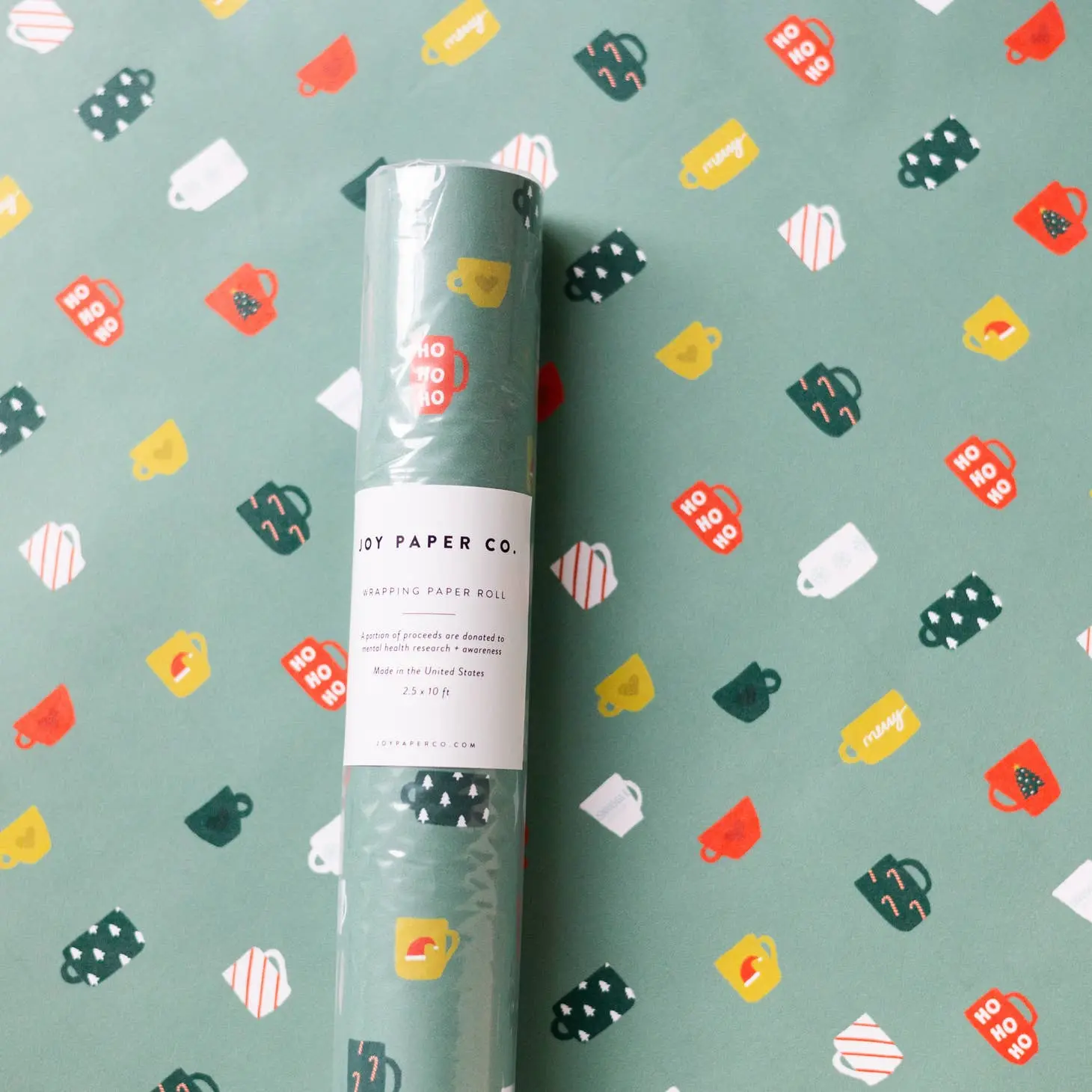 Unwrap a continuous 2.5 x 10ft sheet of festive coffee mug-themed wrapping paper! Comes sealed in a poly bag, made right here in the USA.