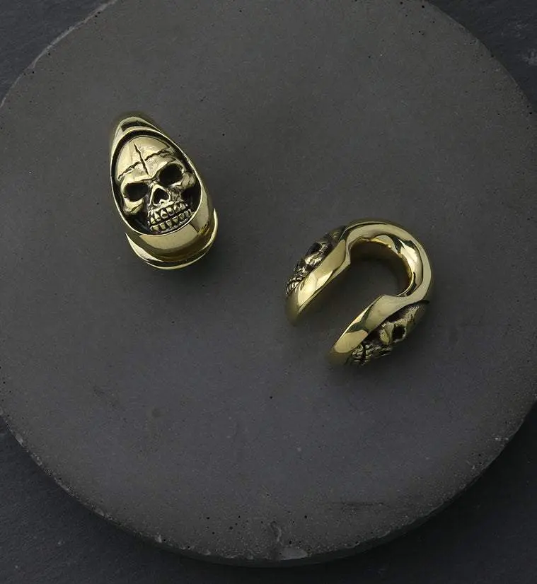 Handcrafted, keyhole shaped brass ear weights with a face of death design. Height: 25mm, width: 20mm. Height and width are approximate as these are handcrafted. Size is 2G (6mm) with an approximate weight of 19 grams each. Sold in pairs (2pcs).