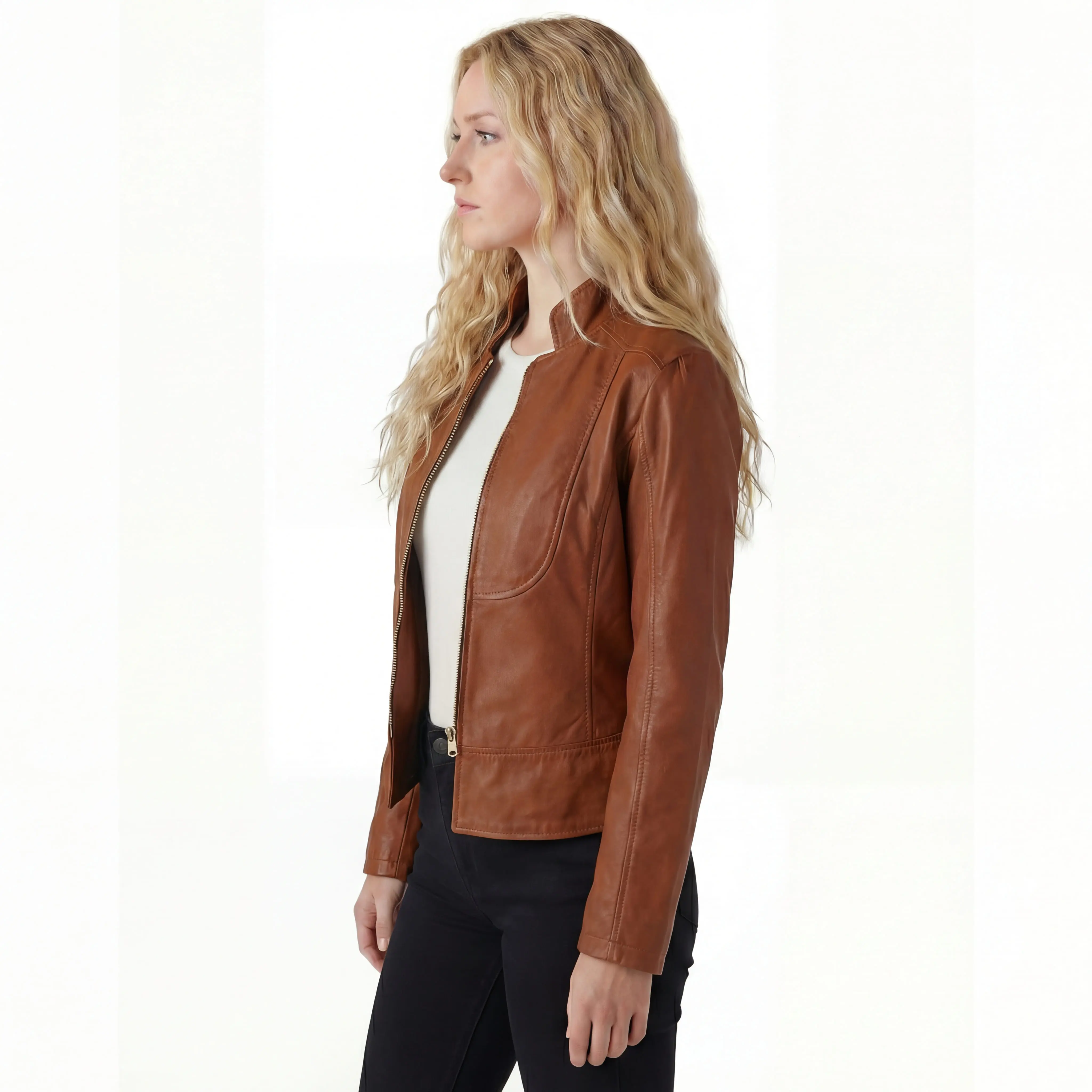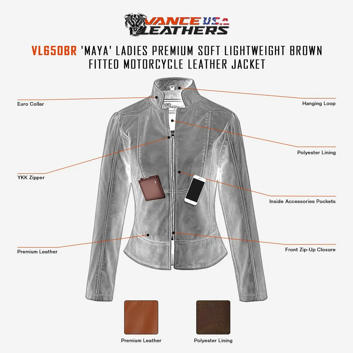 Vance Leathers' Ladies Premium Soft Lightweight Brown Fitted Leather JacketFeatures: