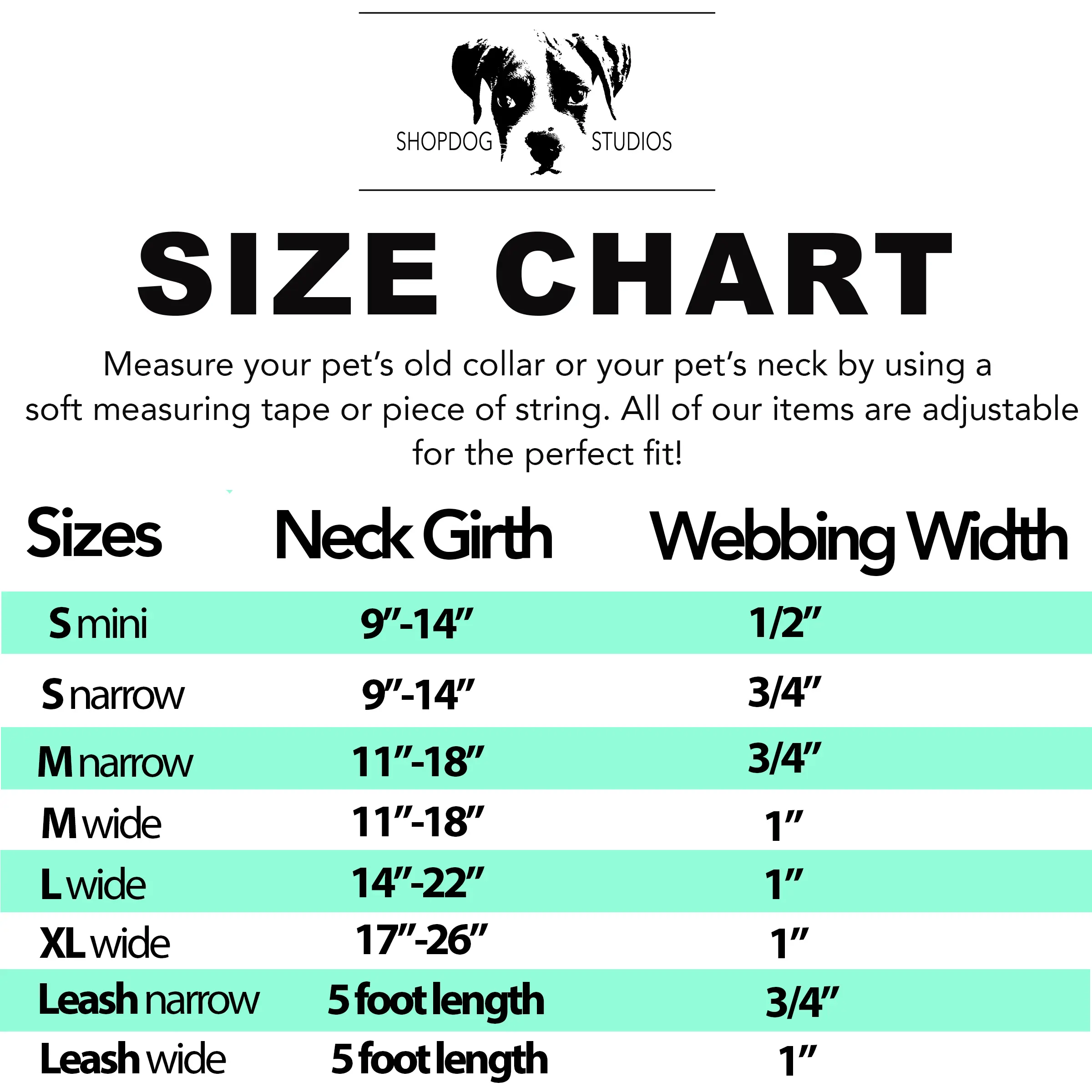 Leash: 5 feet long and is available in 1 inch width (Wide) only