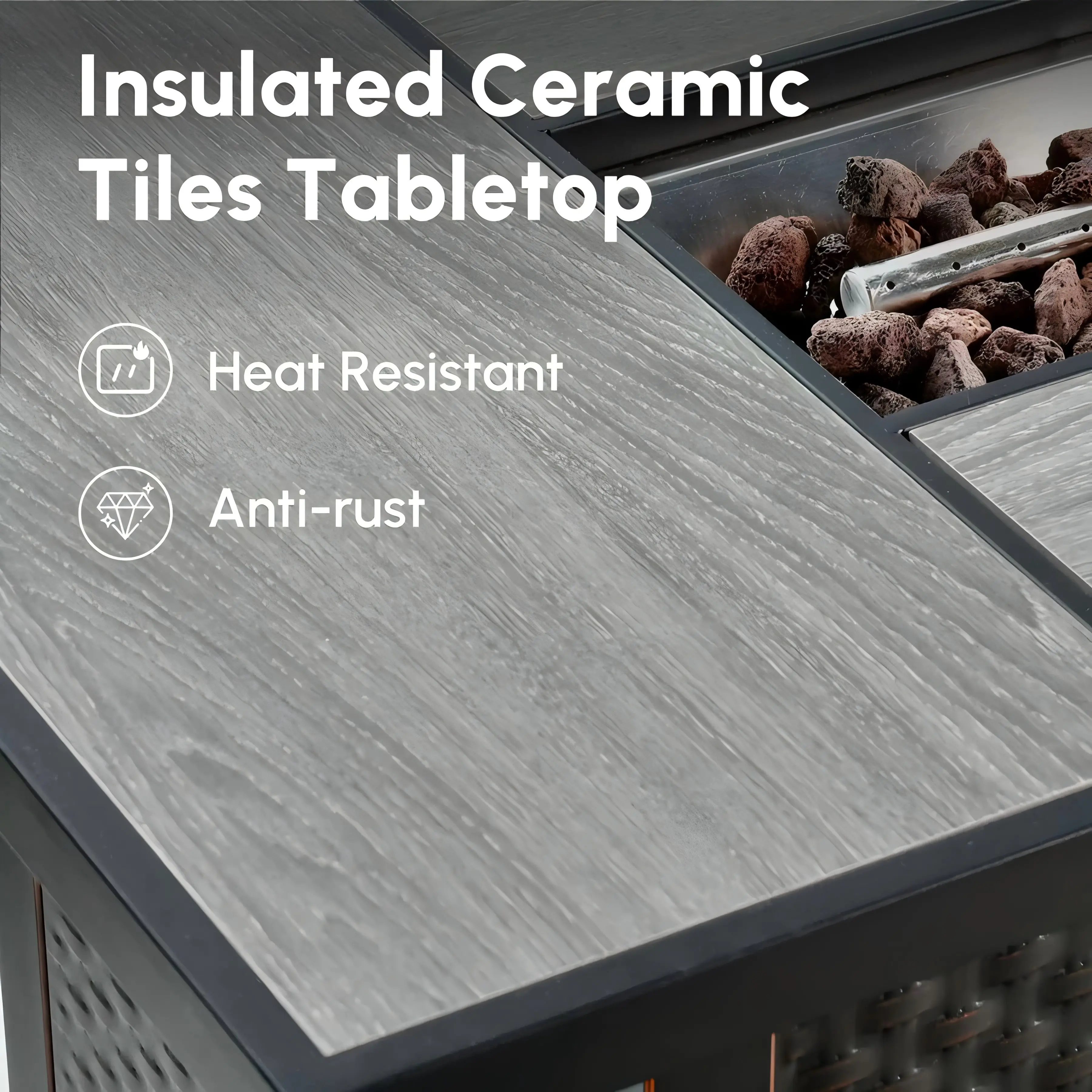 Overall Dimensions 42"W x 25"D x 25"H Fire Bowl Dimensions 23" x 7.5" Grill Tank Not included Burning Area Material Stainless Steel Desktop Material Ceramic tile Exterior Material Steel Finish Metal Steel Fuel Type Propane Burn Time of Fuel Accommodated 6 hours Ignition Type Electronic ignition, control knob Adjustable Flame Yes BTU Output 50,000 BTU Filler Accommodated Lava rocks Filler Included Yes Weather Resistant Yes Cover Included Yes Product Care Do not pressure wash Location Outdoor Use Only Hidden Fuel Tank Yes Product Shape Rectangle Gas Tank Size Accommodated 20 lbs. Tools Needed for Assembly All tools Included Warranty Length 1 year Full or Limited Warranty Limited