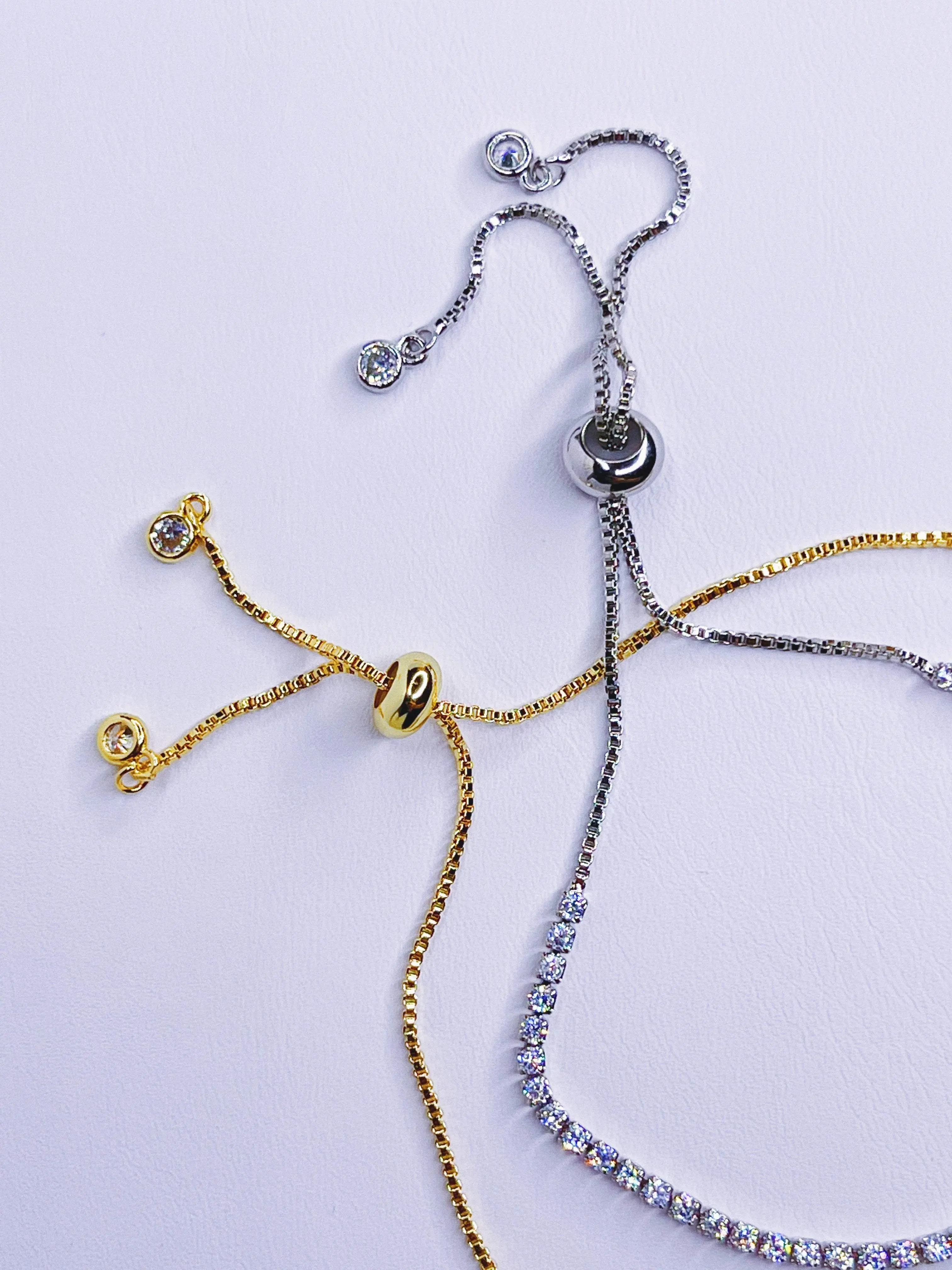 The ultimate sparkle on these micro tennis bolo bracelets makes for the perfect stackable bracelet or just for minimalist wear.