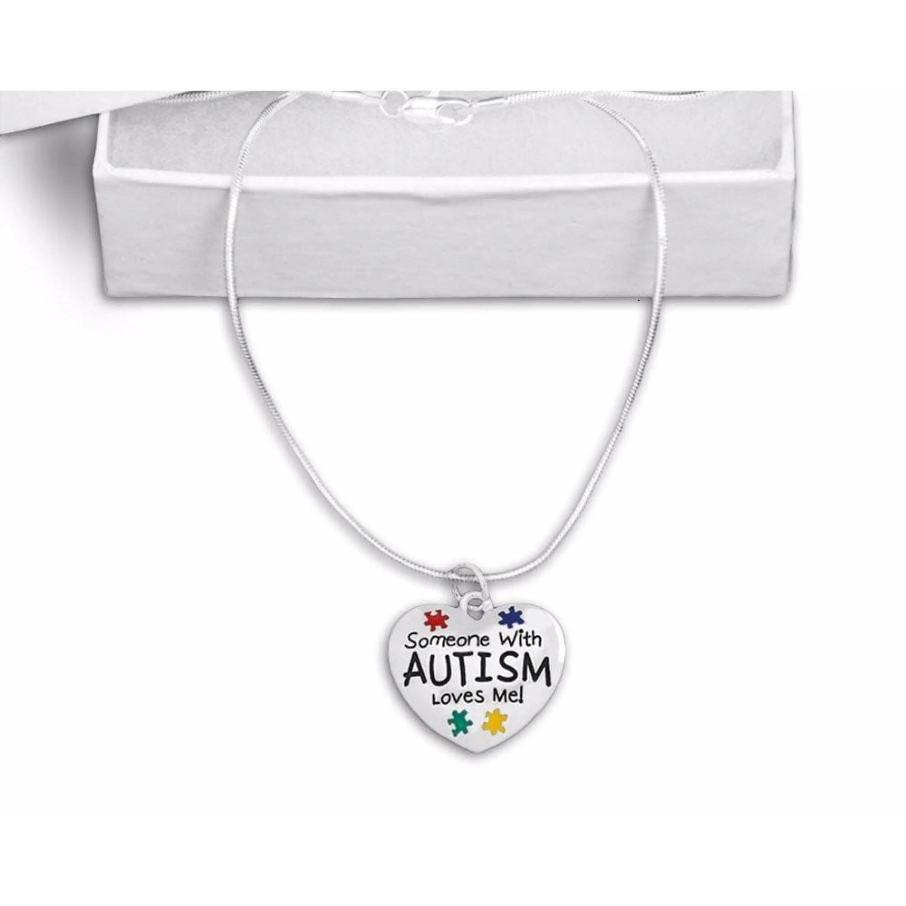 This autism awareness necklace has a different color puzzle pieces and says "Someone With Autism Loves me" charm on a silver snake chain with a lobster clasp. The necklace is 16 or 18 inches long sterling silver plated or sterling silver and the charm is approximately 1 inch by 1 inch. This sterling silver or silver plated necklace can come in a gift box.