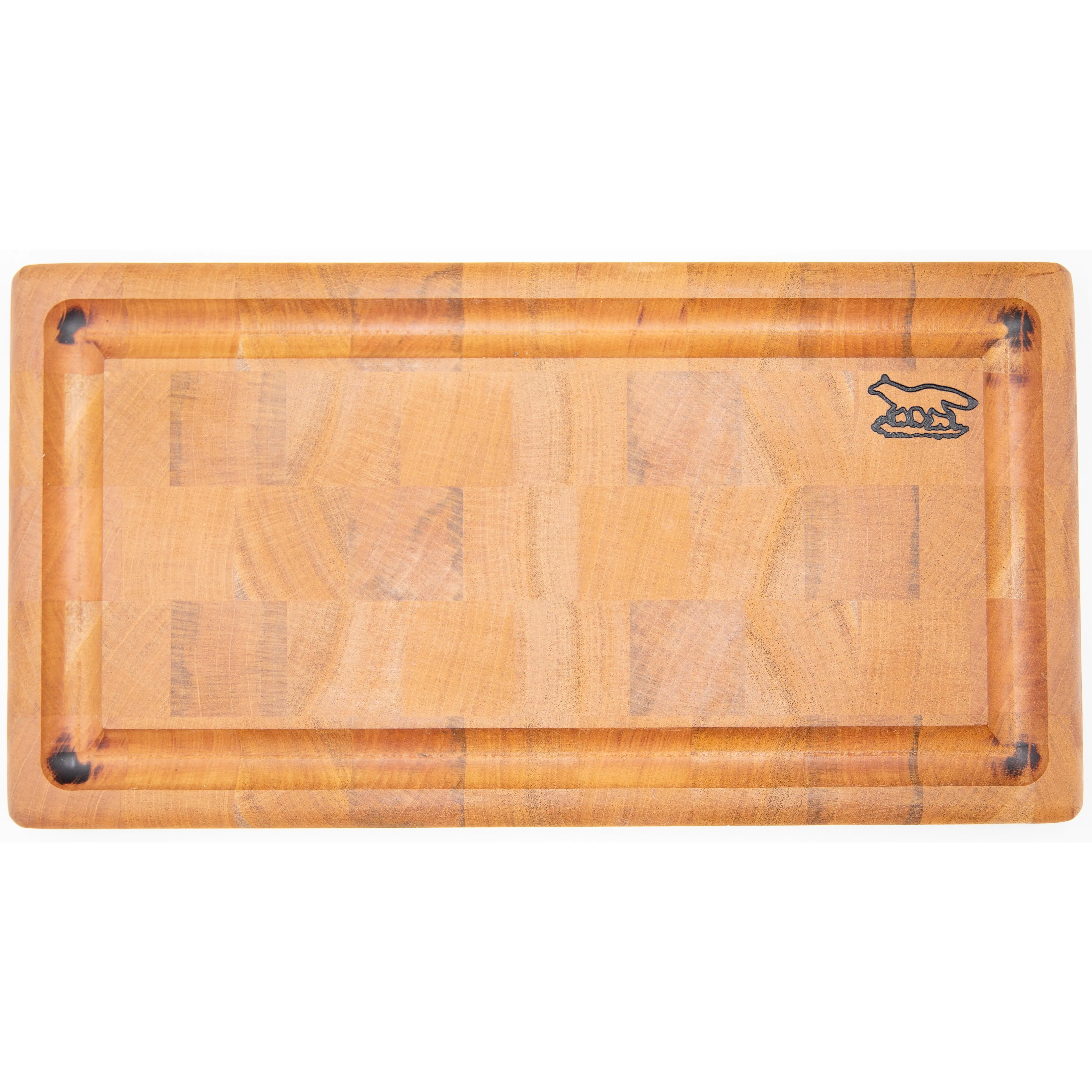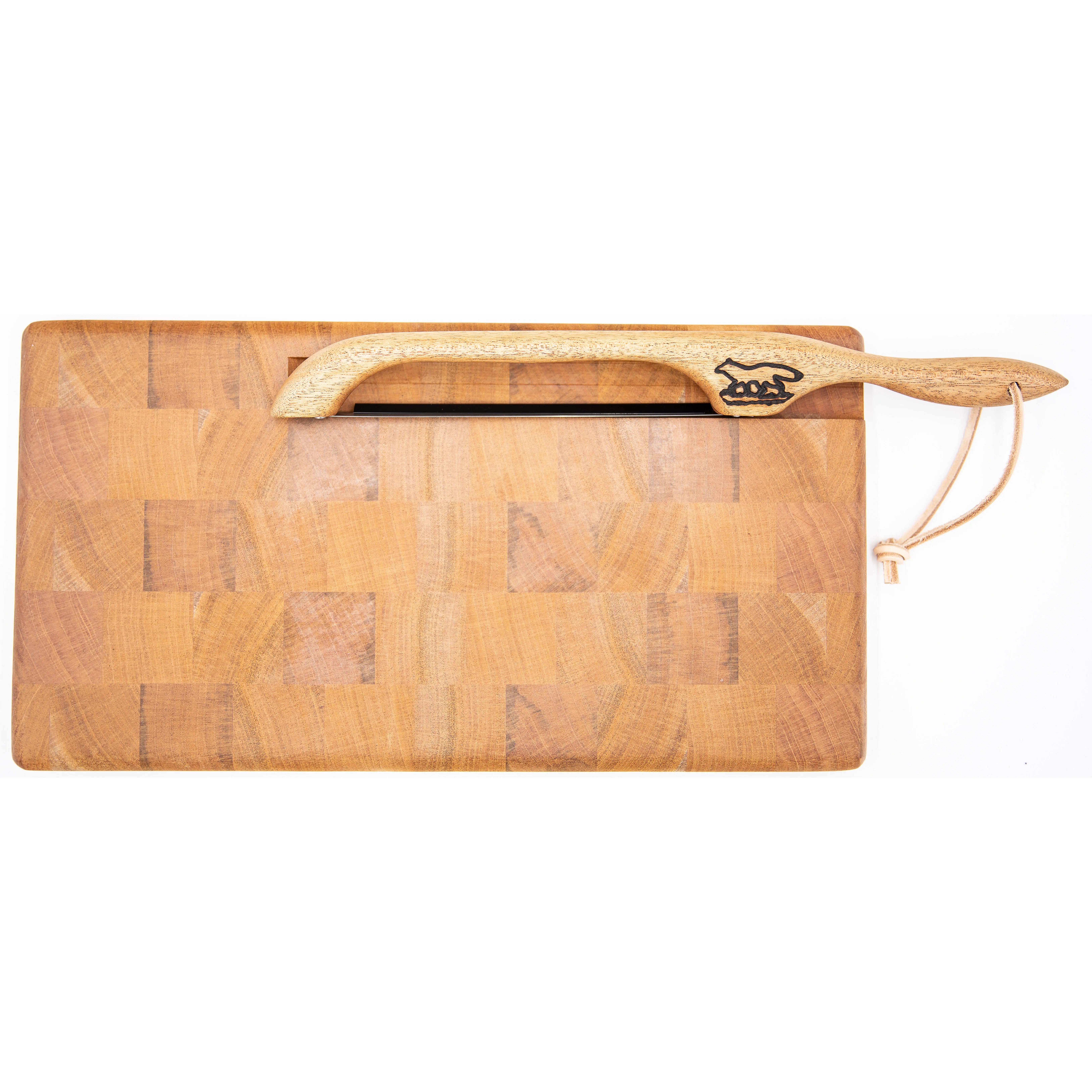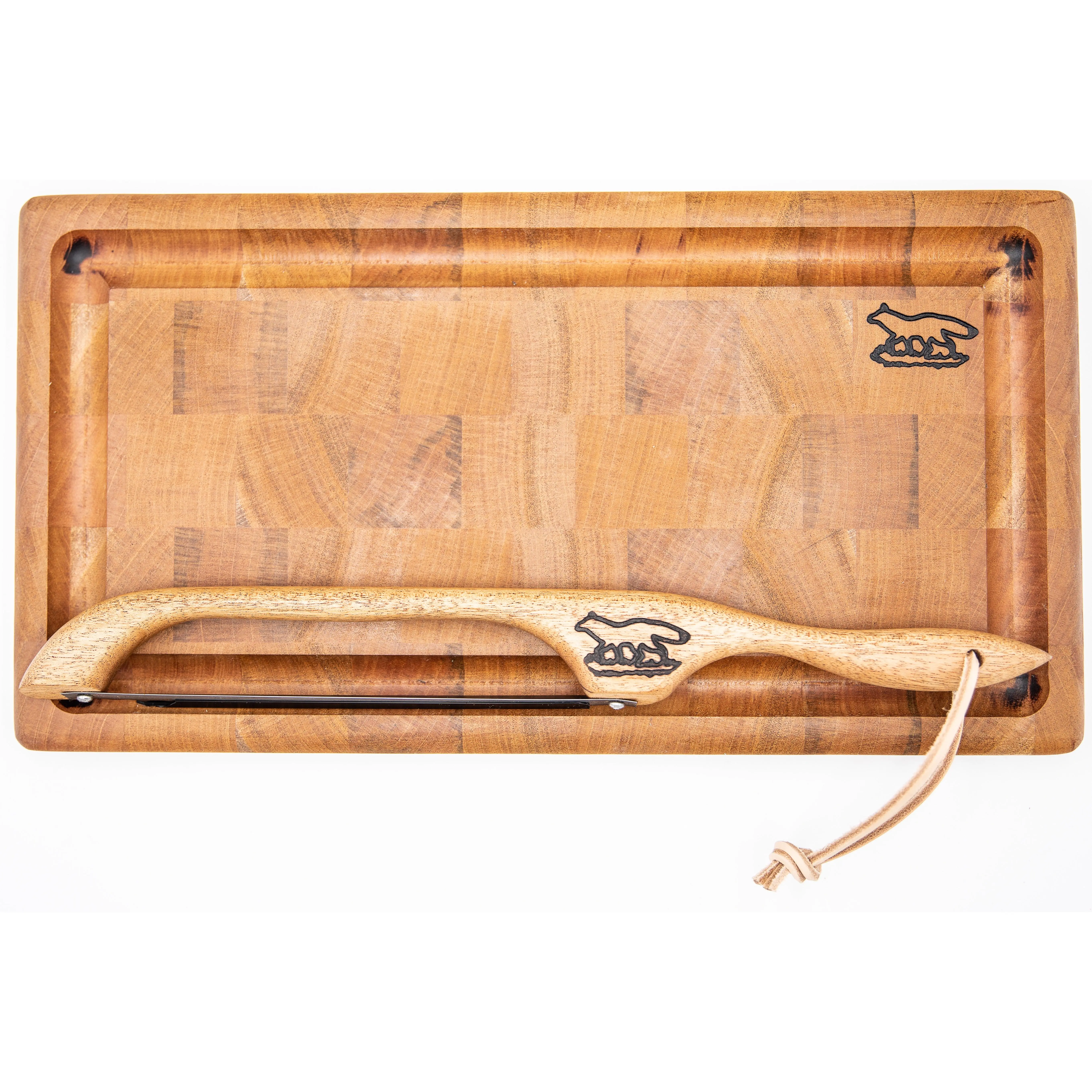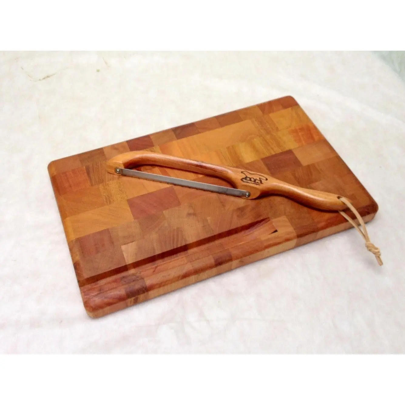 This end grain solid mahogany cutting board comes with a blood route on one side and the knife slot on the other. It will last you a life time as long as you continue to oil it. With it being an end grain, it will not scar as deeply when you cut on it because of it being end grain (the end of the wood on top which is three times harder than top grain). The carbon steel bow knife will stay sharp for at least 15 years as long as you take care of it. The bow knife will cut fresh bread, tomatoes, apples(they do not turn brown when you cut with this knife), pineapple, butternut squash, sweet potato, shreds cabbage and lettuce, onions sliced paper thin, celery(no strings), cooked meats, and more. This set comes with care instructions. Just choose the size of board you want.This board is 1 3/8 inches thick.