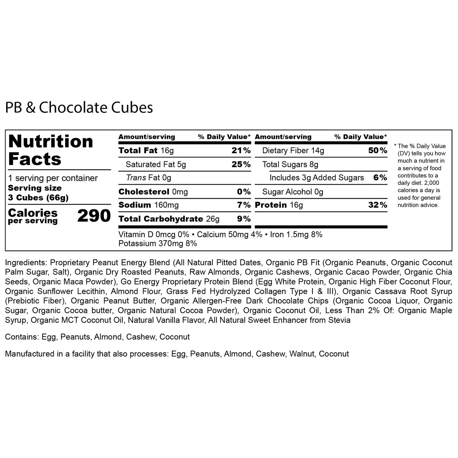Ingredients: Proprietary Peanut Energy Blend (All Natural Pitted Dates, Organic PB Fit (Organic Peanuts, Organic Coconut Palm Sugar, Salt), Organic Dry Roasted Peanuts, Raw Almonds, Organic Cashews, Organic Cacao Powder, Organic Chia Seeds, Organic Maca Powder), Go Energy Proprietary Protein Blend (Egg White Protein, Organic High Fiber Coconut Flour, Organic Sunflower Lecithin, Almond Flour, Grass Fed Hydrolyzed Collagen Type I & III), Organic Cassava Root Syrup (Prebiotic Fiber), Organic Peanut Butter, Organic Allergen-Free Dark Chocolate Chips (Organic Cocoa Liquor, Organic Sugar, Organic Cocoa butter, Organic Natural Cocoa Powder), Organic Coconut Oil, Less Than 2% Of: Organic Maple Syrup, Organic MCT Coconut Oil, Natural Vanilla Flavor, All Natural Sweet Enhancer from Stevia