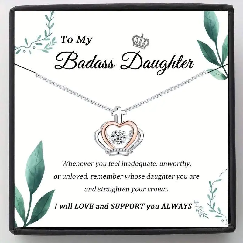 To My Badass Daughter Necklace Introducing the To My Badass Daughter Necklace – "Crown of Confidence" This necklace is a celebration of the strength and individuality of a beloved daughter. A symbol of encouragement, it's designed to remind her of her worth and the unwavering support she has behind her. Features: Inspirational Design: Features a heart embraced by a crown, symbolizing love and empowerment. Quality Craftsmanship: Made with sterling silver and a touch of rose gold, embodying the perfect balance of elegance and boldness. Empowering Message: Comes with an affirmation to remind her of her inner strength and your eternal support. With Every Purchase: 1 To My Badass Daughter Necklace 2 Custom 'Empowerment' Stickers Care Instructions: Maintain the necklace's shine by cleaning with a soft cloth and avoiding chemical exposure. Gift this necklace to your daughter as a token of love and a reminder to always wear her crown with pride. Order the To My Badass Daughter Necklace now and let her carry your love and strength wherever she goes!