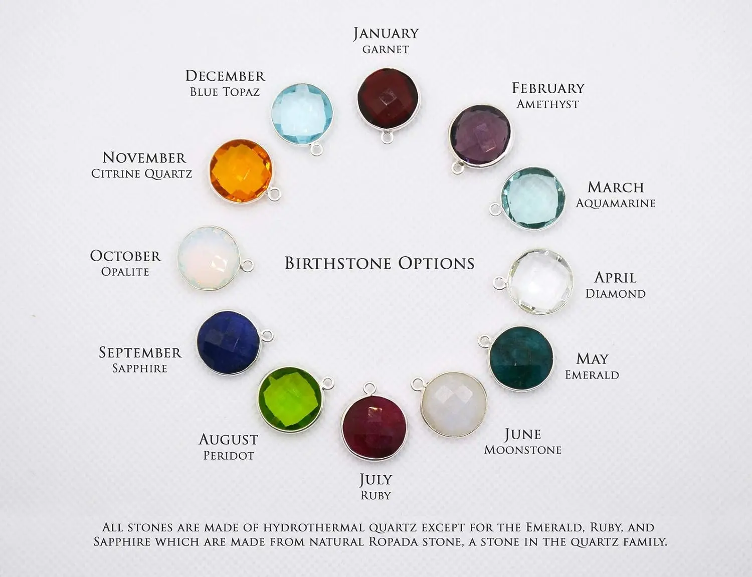 Customize your piece further by selecting from our range of chain options, available in sterling silver or 18k gold-filled, with lengths of 16, 18, or 20 inches to suit your style. The birthstones are crafted with precision, featuring hydrothermal quartz for sterling silver frames, and natural Ropada stone for Emerald, Ruby, and Sapphire. Meanwhile, our 18k gold-framed stones boast the same exquisite hydrothermal quartz, with the exception of natural Moonstone and Emerald, crafted from natural Ropada stone.
