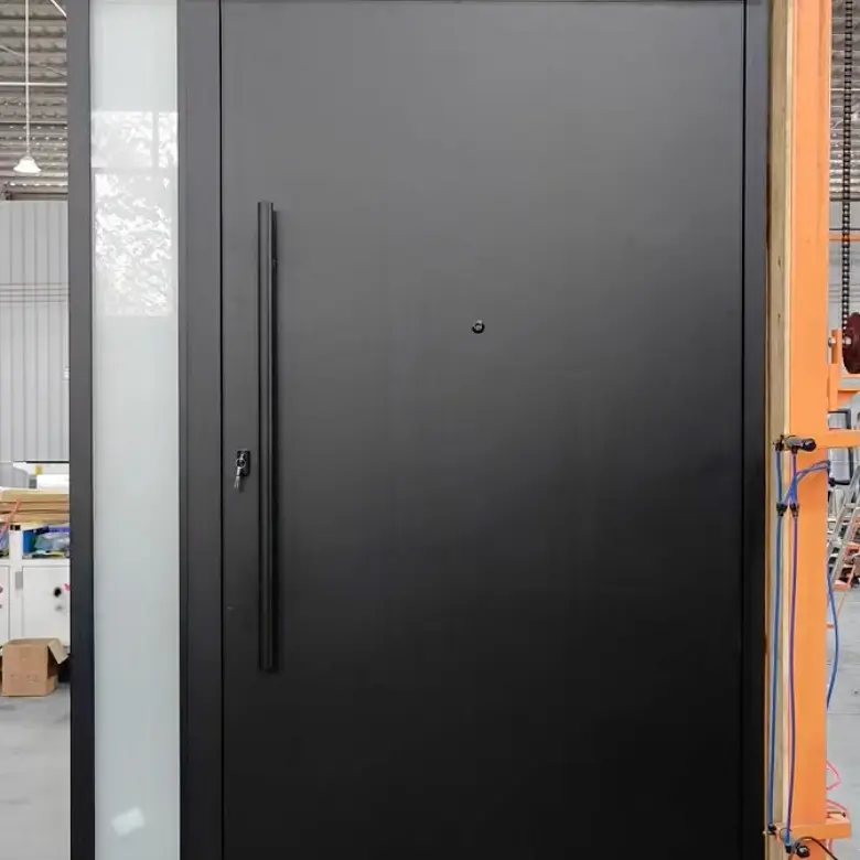 Introducing our Matte Black Pivot Door with Frosted Sidelight – a contemporary masterpiece designed for those who appreciate sleek sophistication.