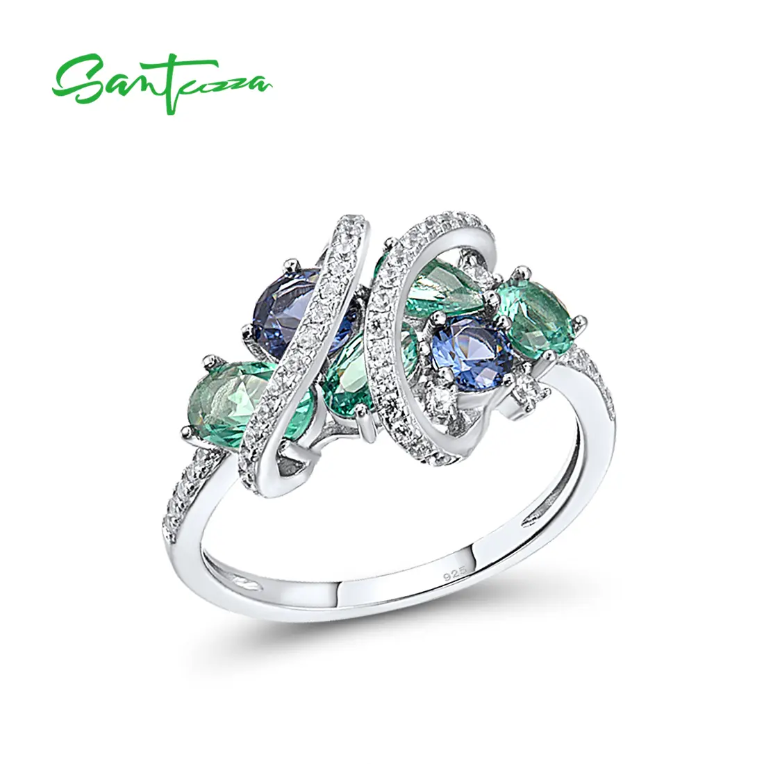 SANTUZZA Created Green And Blue Spinel White Cubic Zirconia 925 Silver Ring For Women Fine Jewelry