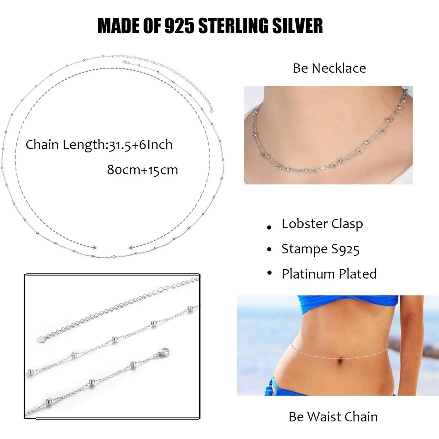 ·SIZE AND DETAILS:The width of the chain on the minimalist beach chain measures around 1 mm. The durable chain is the leading role of this beautiful sexy bikini chain.The length of the silver waist chain is about 31.5”+ 6”extender. And the lobster clasp of the adjustable chain helps the necklace be worn easily.