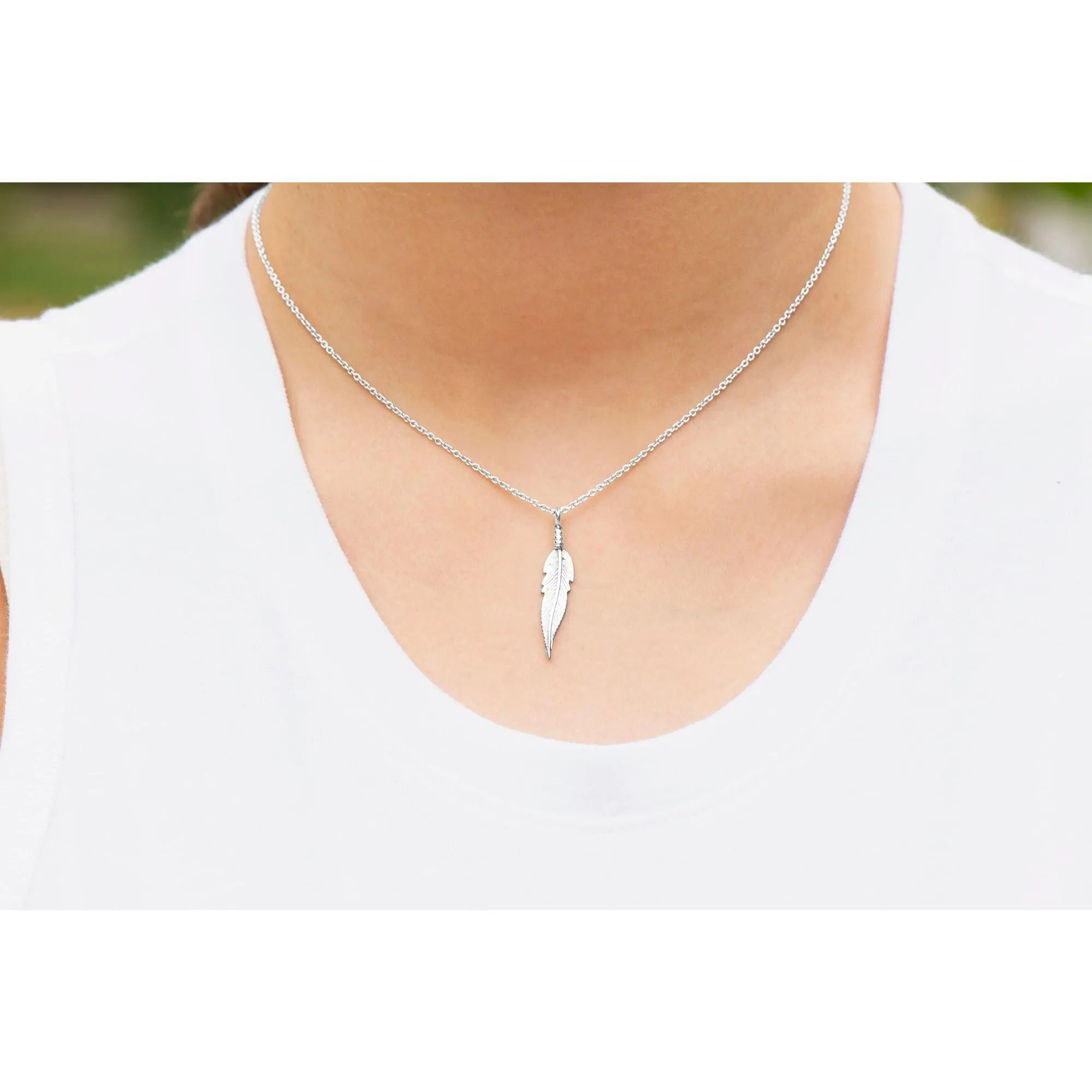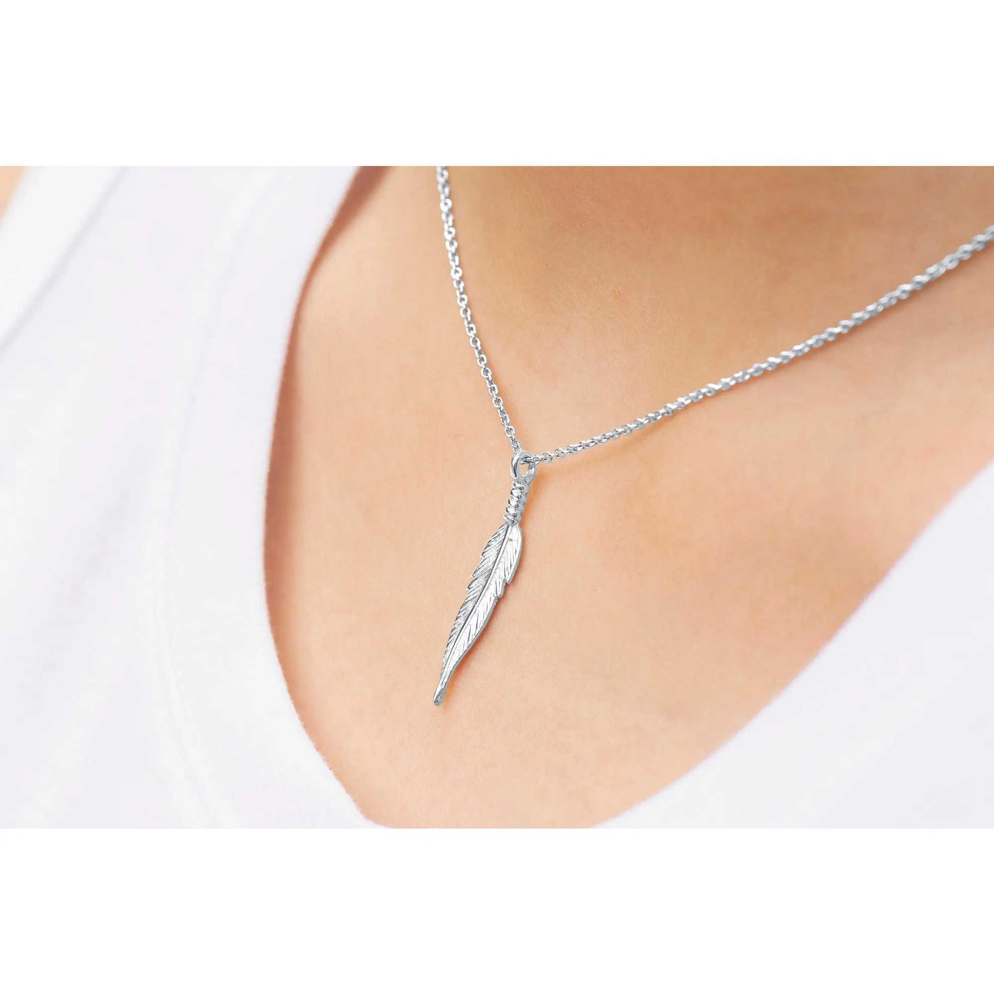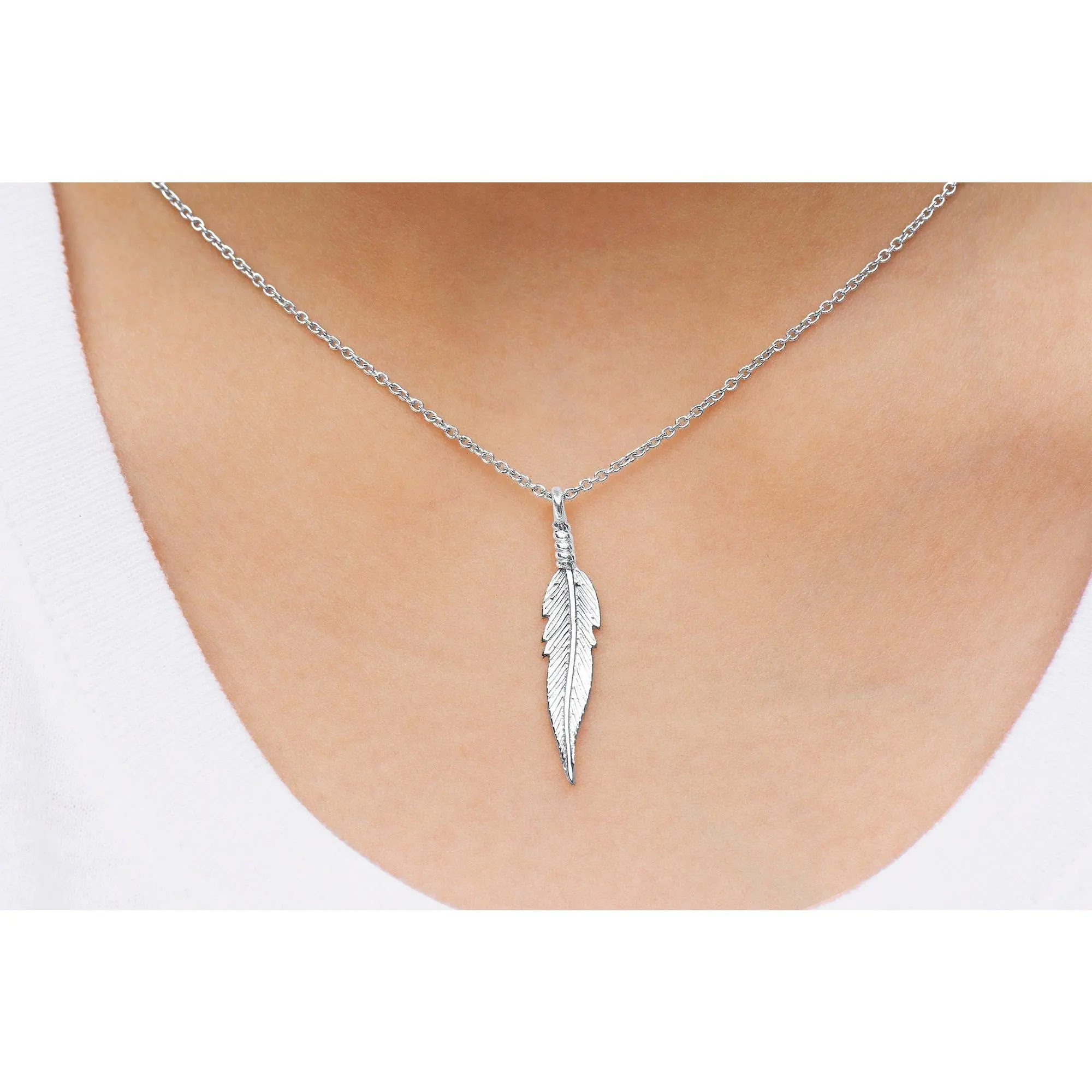Sterling Silver Slim Feather Pendant, The Dainty Feather Charm Necklace is a Double-sided feather design with a sterling silver cable link chain and fun everyday feather jewelry.