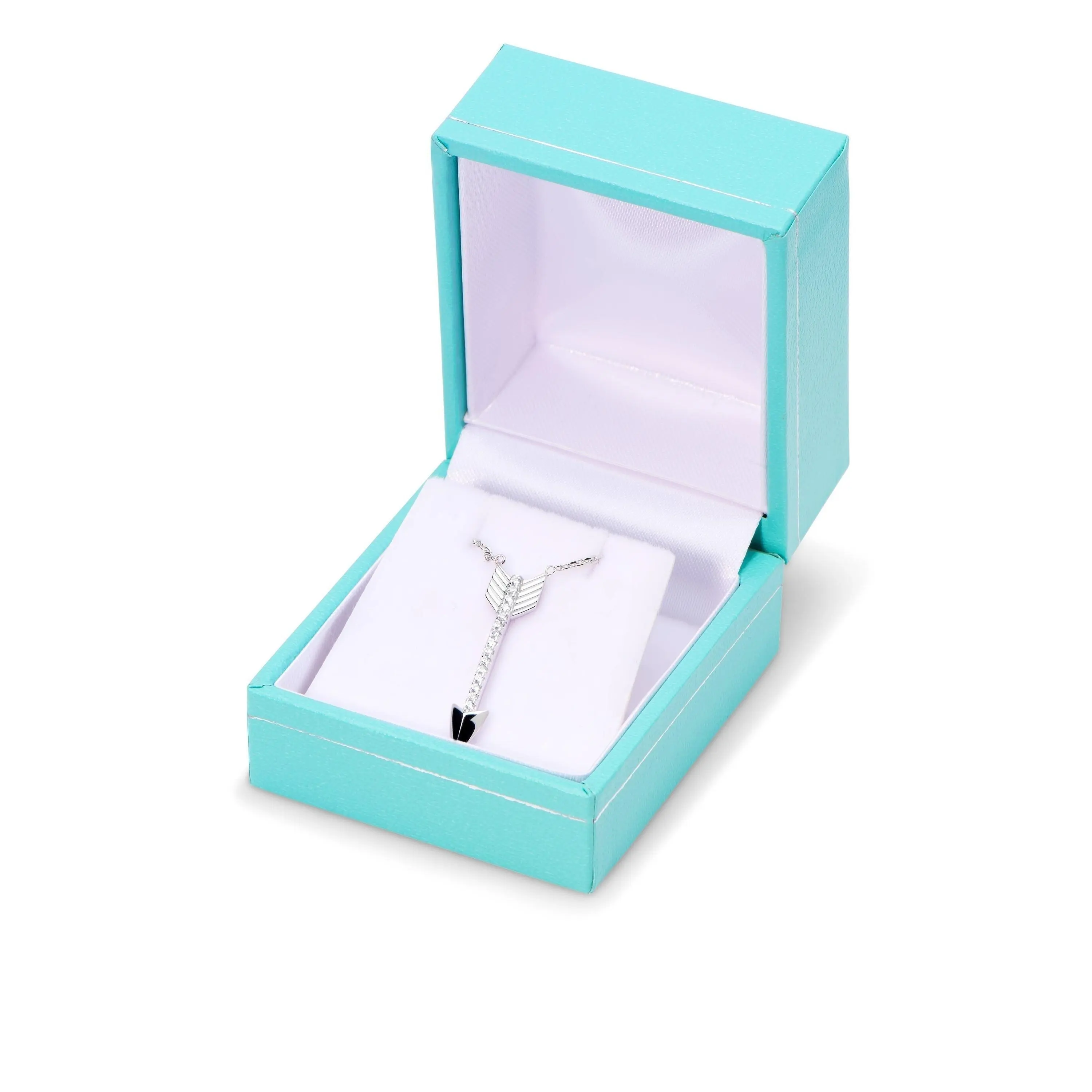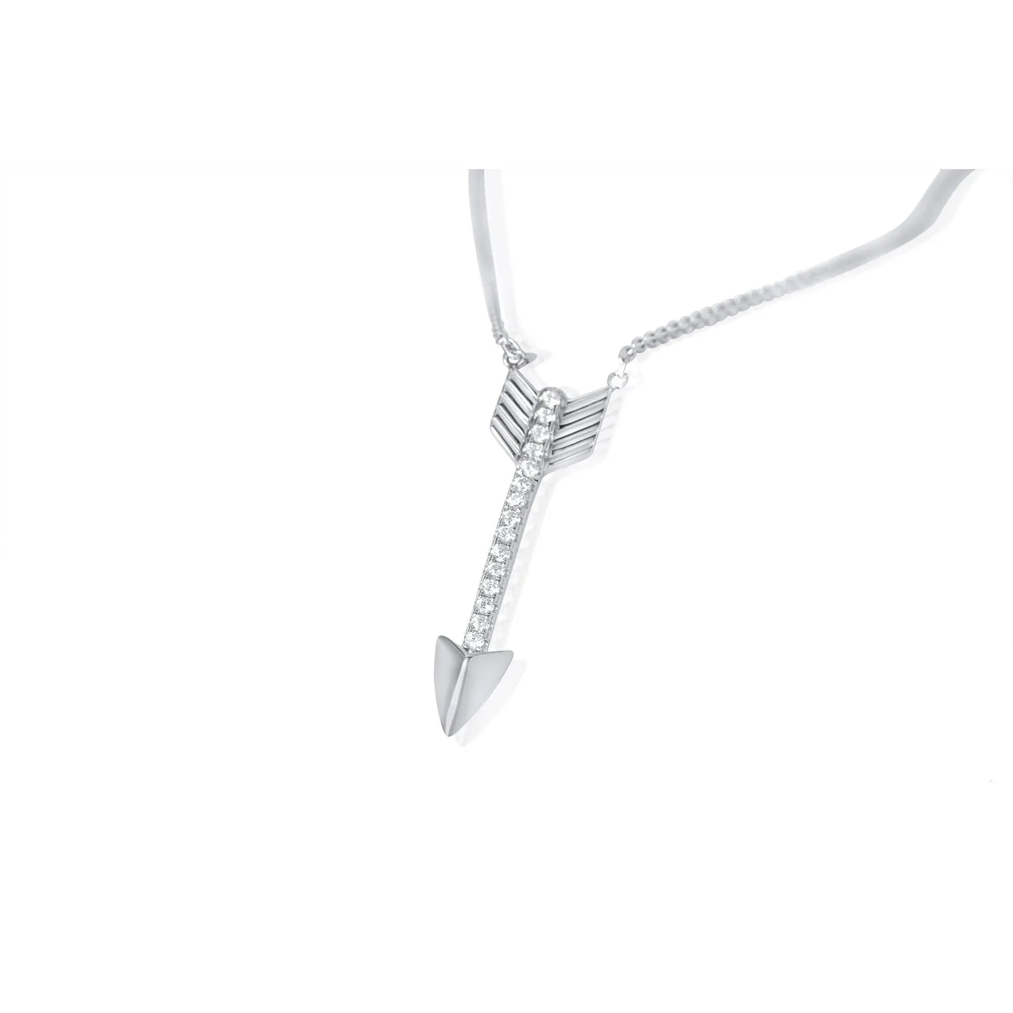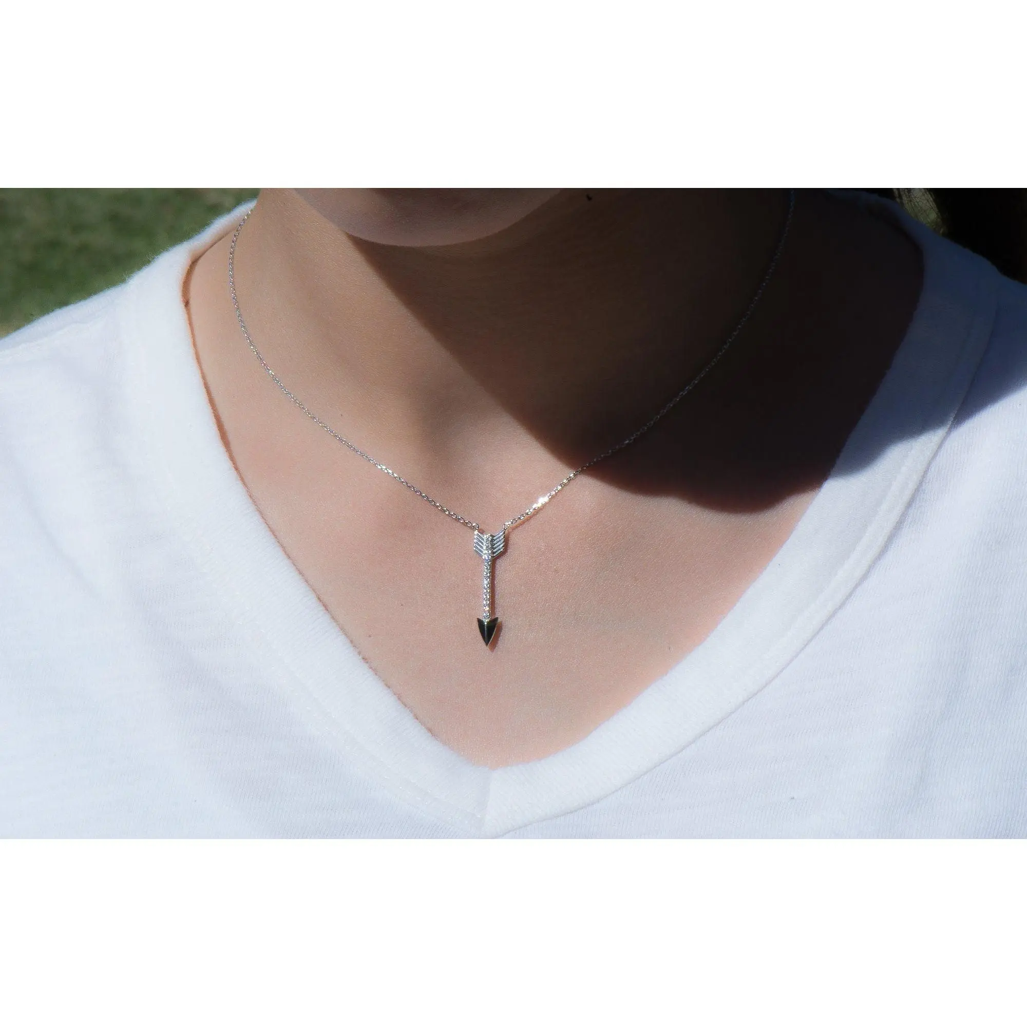 Solid Sterling Silver Vertical Arrow Necklace, 15 round brilliant cut cubic zirconia are prong set on this pointing down Arrow design. The Sterling Silver 16" cable link chain has a 1.5" extension so you can adjust the length. Aim straight to her heart with this on-trend fashion necklace.
