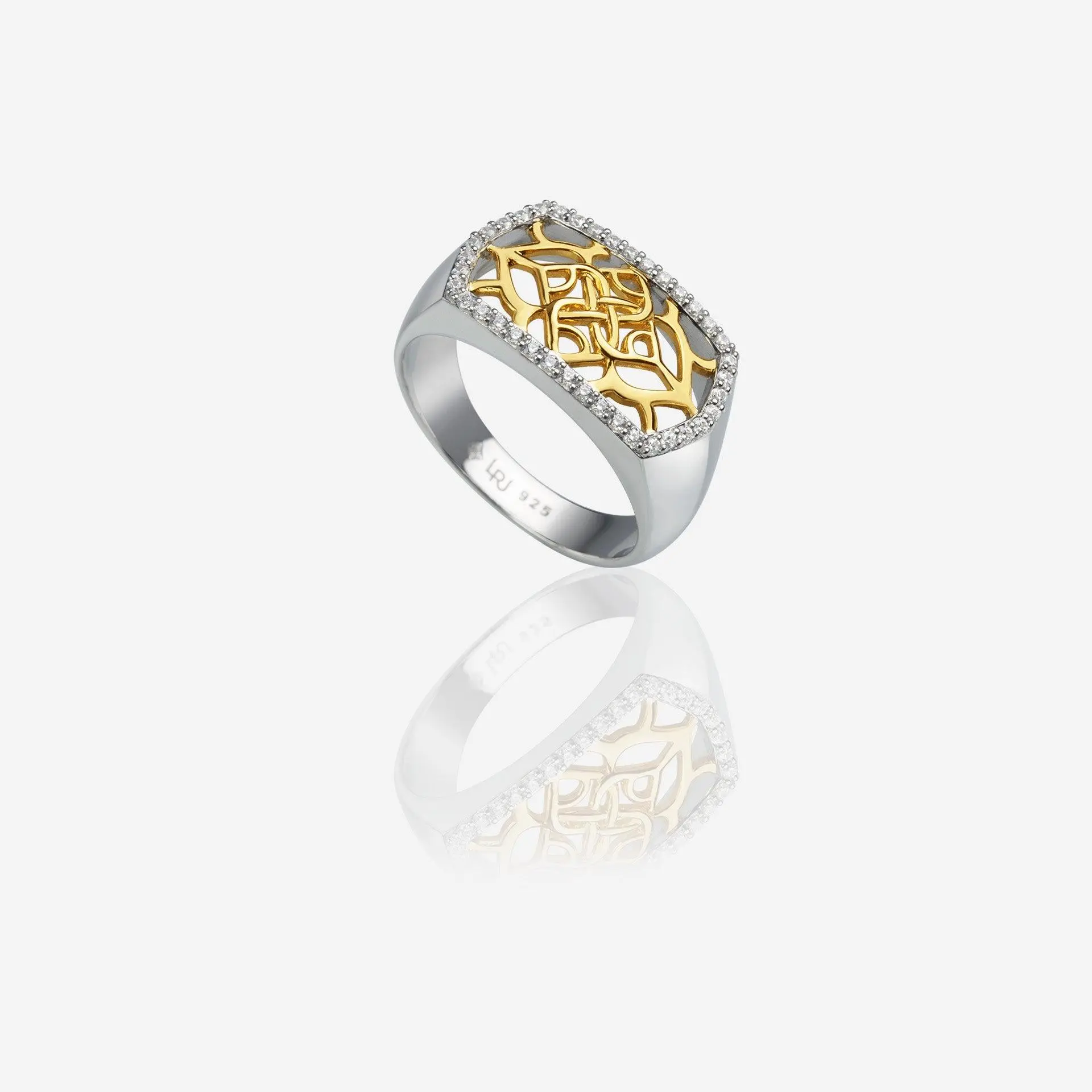 The Lattice Rose Ring is one part signet, one part filigree, and all parts bold style. Available in sterling silver and yellow gold finish.