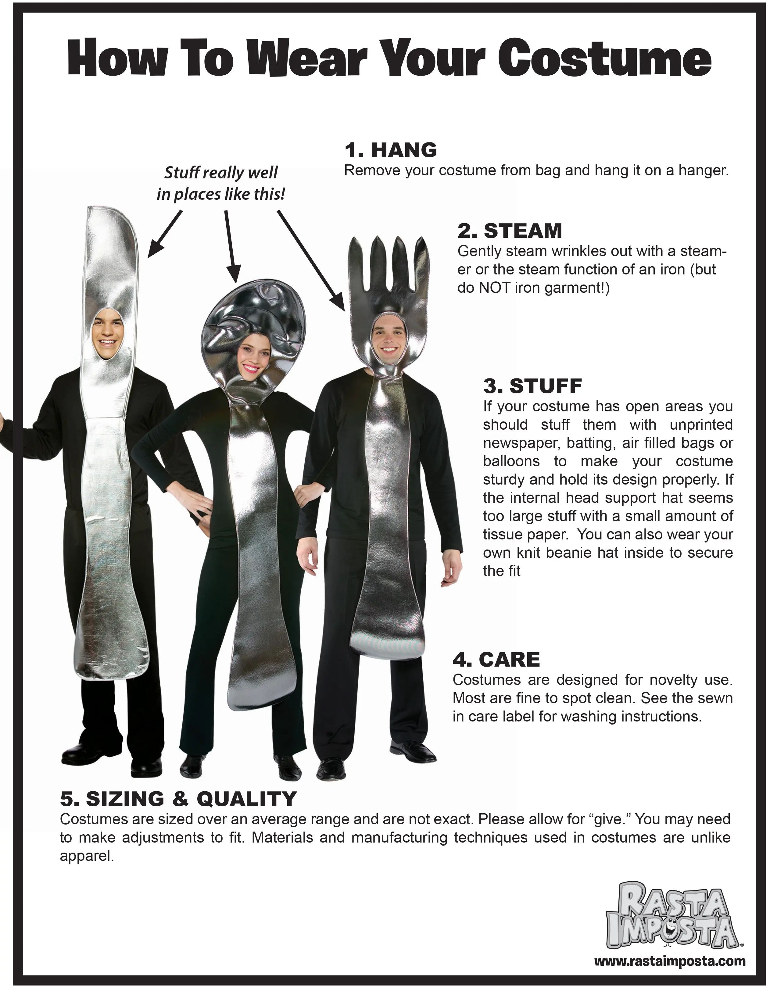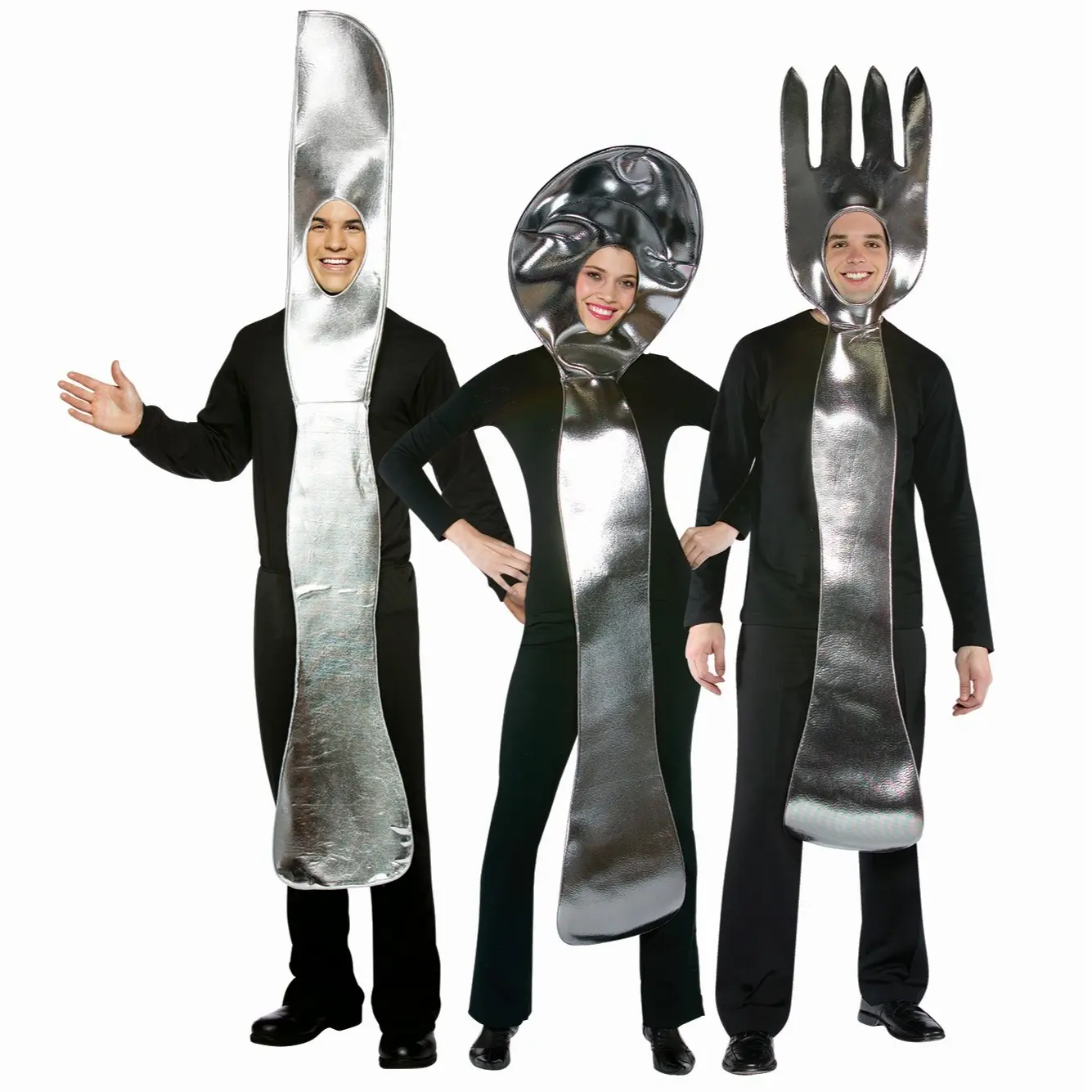 This costume 3 pack includes one Knife, one Fork and one Spoon. The poly-foam over-the-head tunic has an opening for your face for party friendly fun. One Size fits most adults.