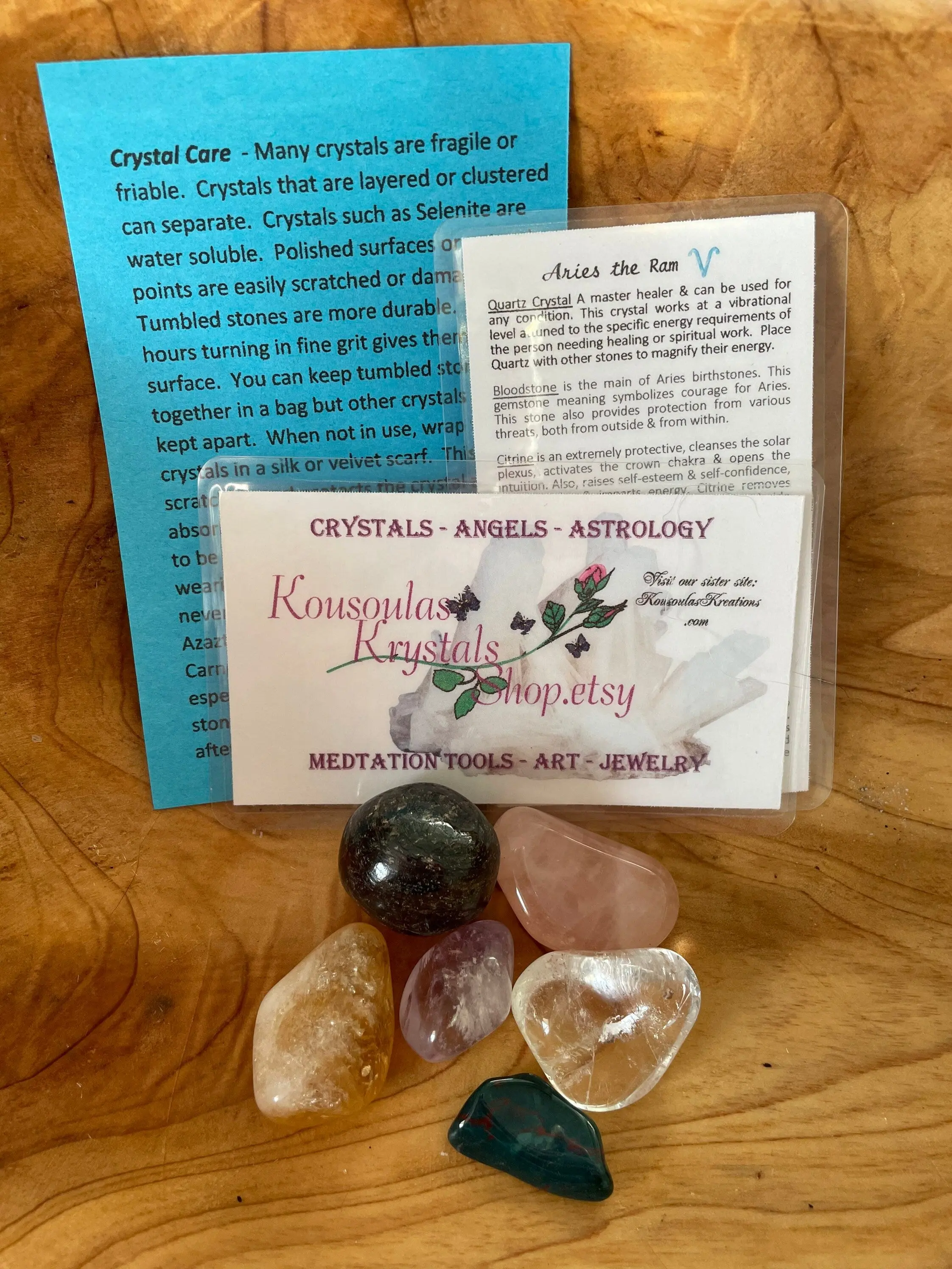 Aries Stones Set includes: Amethyst Bloodstone Citrine Clear Quartz Garnet Rose Quartz Your tumble-polished and/or raw stones and crystals are chosen based on their energetic properties and are intended to complement the ram's positive traits, supplement imbalances, and protect against downfalls. Stones crystal properties, crystal care and cleaning for Aires are included. The stones/crystals will arrived sealed in a beautiful 4" x 6" nylon pouch. Hold them, meditate with them, carry them in your pocket, purse or car, place them on your desk at work, or under your pillow at night. We can’t think of a more personal GIFT for Aires in your life – children and adults alike! 😊 Each stone is unique; size, shape, and color will vary. Stone finish (e.g. tumbled, rough, polished, point, etc.) may vary from what is pictured. All Crystals we sell are cleansed, charged & well cared. They’re perfect for metaphysical uses, healing, grids, meditation & more. The Crystals will be cleansed with Palo Santo, Selenite, or Smudging & charged with a copper Pyramid, Energy tuning tube and/or Rh- energy before they are shipped. Please look to pictures to see all that is included with this set; stones may be raw or tumbled. Because these are natural products, no stone will be alike. Follow us on TikTok KousoulasKrystals!