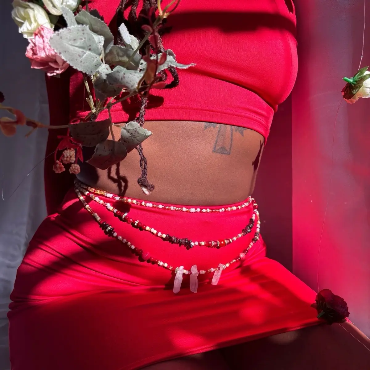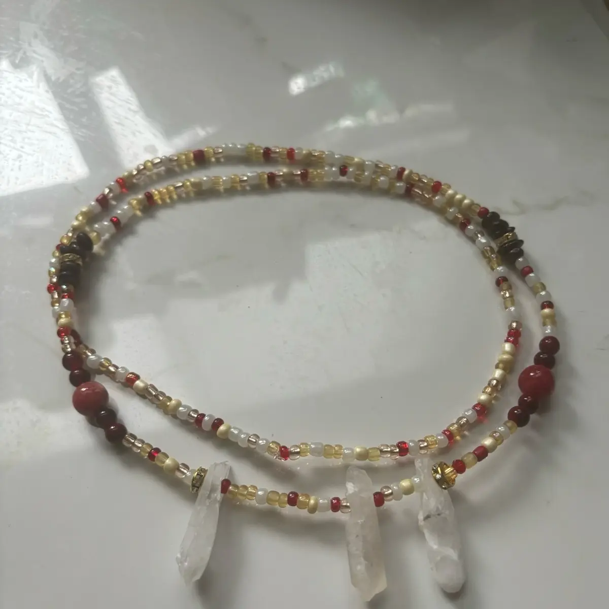 A set of three (3) handmade elastic waist crystals, featuring a mixture of gold, cream, white, and red glass beads, large red and gold glass beads, natural Garnet chips, and medium/large sized clear quartz points.