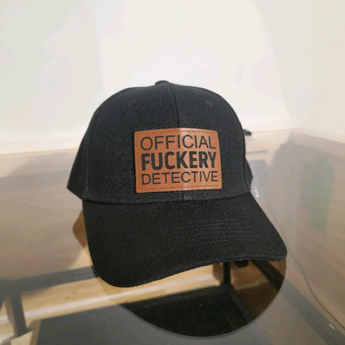 le fit and durable construction, this hat is sure to become a staple in your wardrobe. Whether you're on the job or just out running errands, you'll appreciate its practicality and undeniable style. So why wait? Order your own 'Official Fuckery Detective Leather Patch Hat' today!
