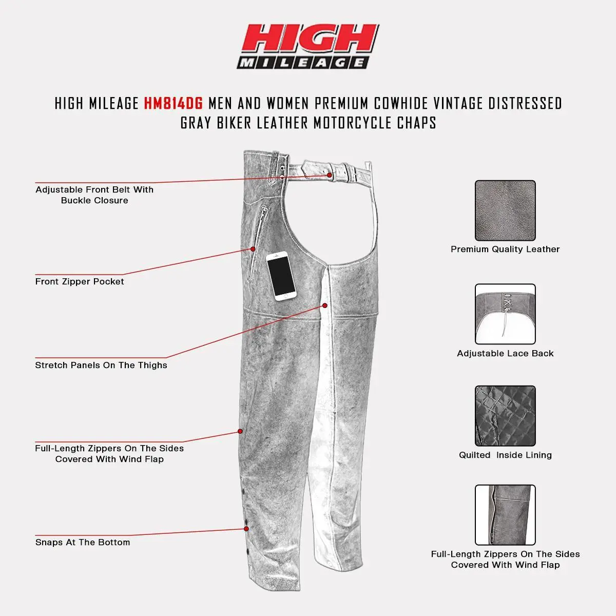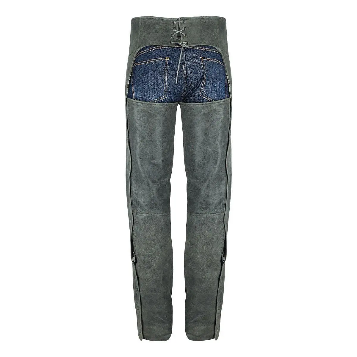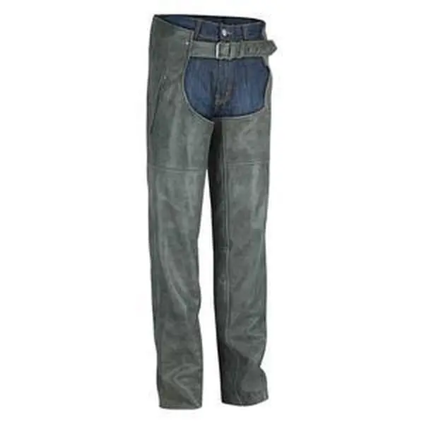 Made with premium quality distressed leather, the chaps are built to last and give you that rugged, vintage look that is so popular among bikers today. The adjustable front belt with buckle closure and adjustable back lace provide a secure and comfortable fit, while the front zipper pocket allows for easy access to your essentials. The stretch panels on the thighs provide optimal flexibility and comfort during your ride. Inside, you'll find a quilted lining that provides warmth and added comfort on chilly days. The full-length zippers on the sides are covered with wind flaps to prevent cold air from penetrating and to make them easy to put on and take off. The snaps at the bottom make them compatible with shoes and boots, ensuring that you can wear them with your favorite riding footwear.