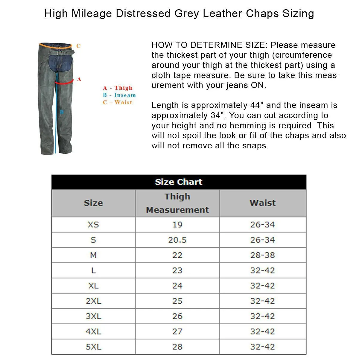HOW TO DETERMINE SIZE: Please measure the thickest part of your thigh (circumference around your thigh at the thickest part) using a cloth tape measure. Be sure to take this measurement with your jeans ON. Length is approximately 44" and the inseam is approximately 34". You can cut according to your height and no hemming is required. This will not spoil the look or fit of the chaps and also will not remove all the snaps.