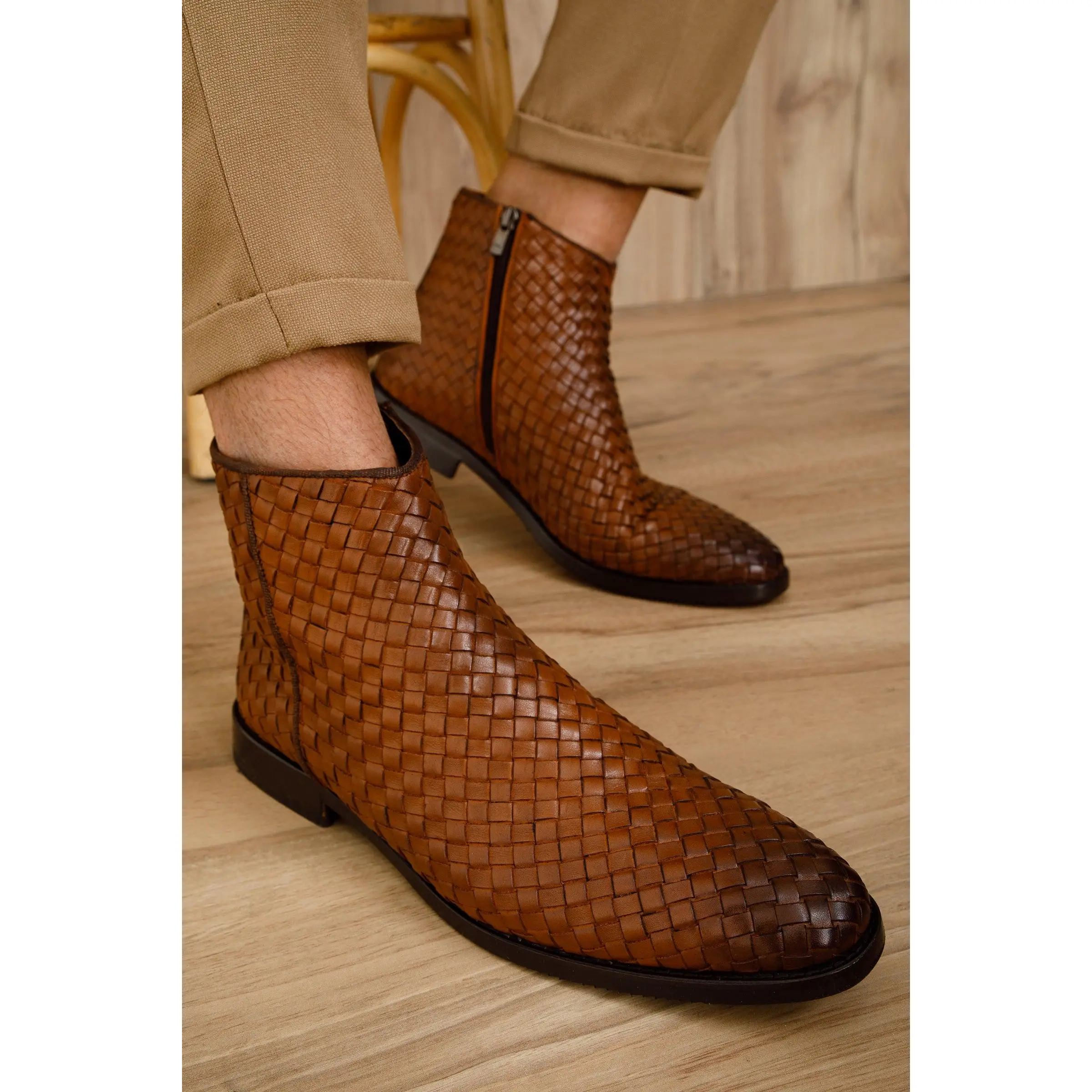 Wellington Tan Handwoven Leather Men Boot with a Zipper: Timeless Craftsmanship and Distinctive Style